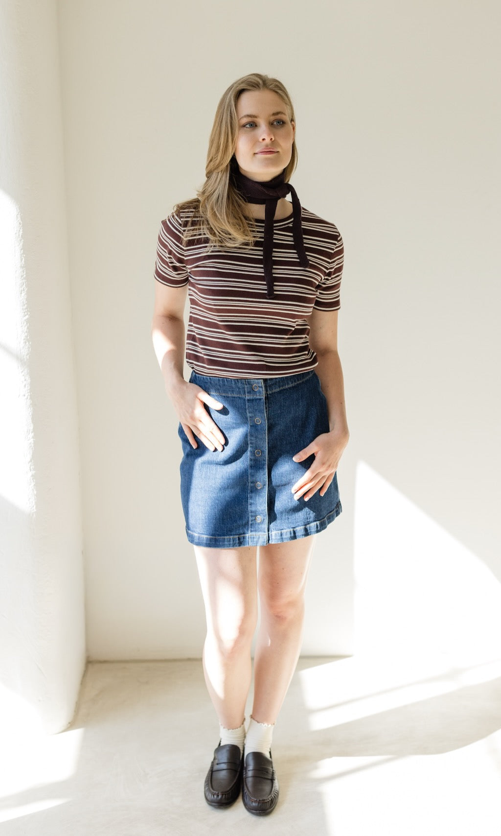 Kleiner Mini Strickschal in braun im Outfit mit rosa gestreiftem Shirt, braunem Rock und Woll Handtasche vor heller Wand Blick seitlich