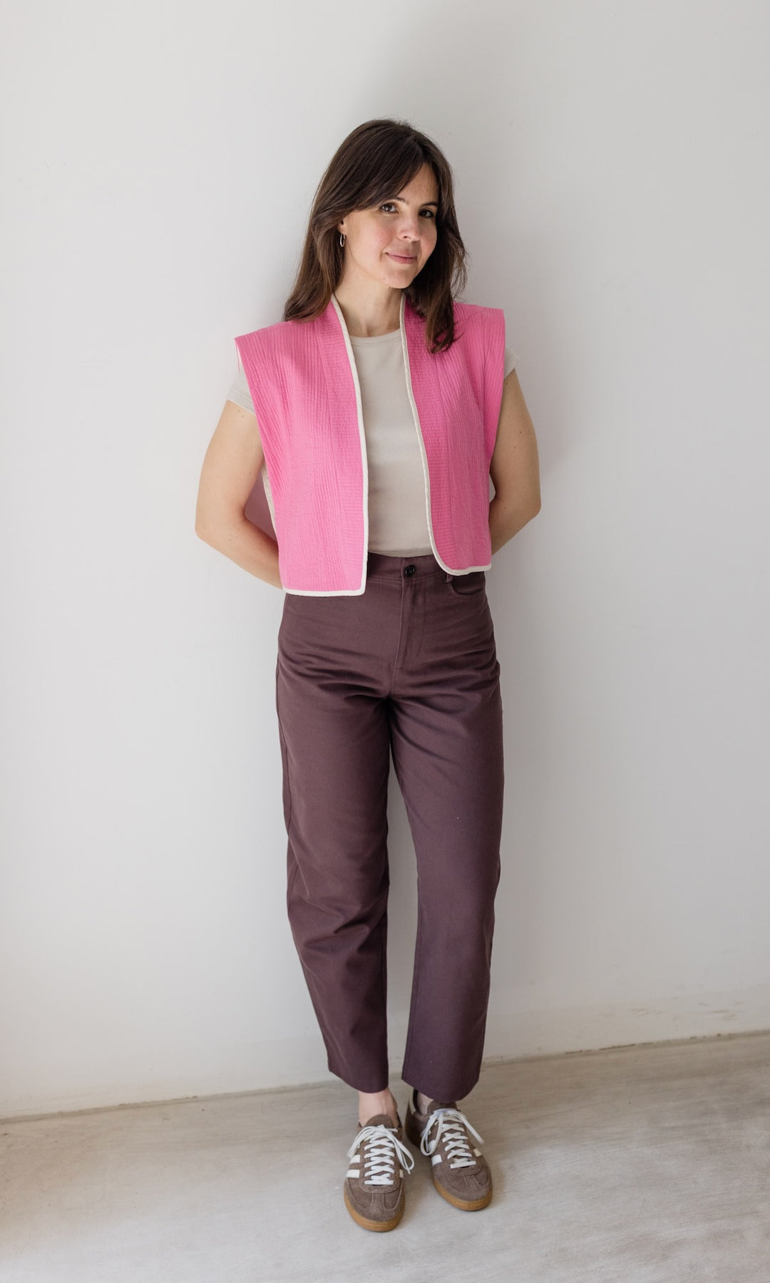 Unsere besondere Steppweste Yumiko im japanischen Stil ist ein zeitloser Allrounder und rundet jedes Outfit perfekt ab. Der moderne kürzere Schnitt mit Betonung des Schulterbereichs setzt ein modisches Statement. Die Weste ist außerdem wendbar und somit kannst du sie in Pink oder Creme tragen. Da wir auf die Verwendung natürlicher Fasern bedacht sind, ist die Weste beidseitig aus weicher Baumwolle gefertigt, die charakteristisch eine ungleichmäßigere Oberfläche aufweist.