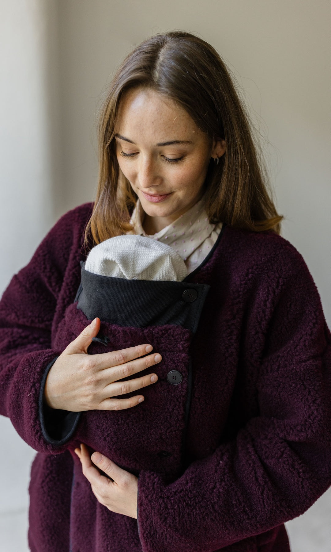 Mit unserem neuen Babytrage-Einsatz wird deine Lieblingsjacke zum treuen Begleiter durch den Winter – auch mit Baby in der Trage. Der Einsatz verbindet sich mittels der Knöpfe nahtlos mit beiden Seiten deiner Schafwolljacke und schenkt dir und deinem Kind wohlige Wärme an kalten Tagen. Wir haben ihn in den Farben Dunkelblau, Creme und Weinrot entworfen.