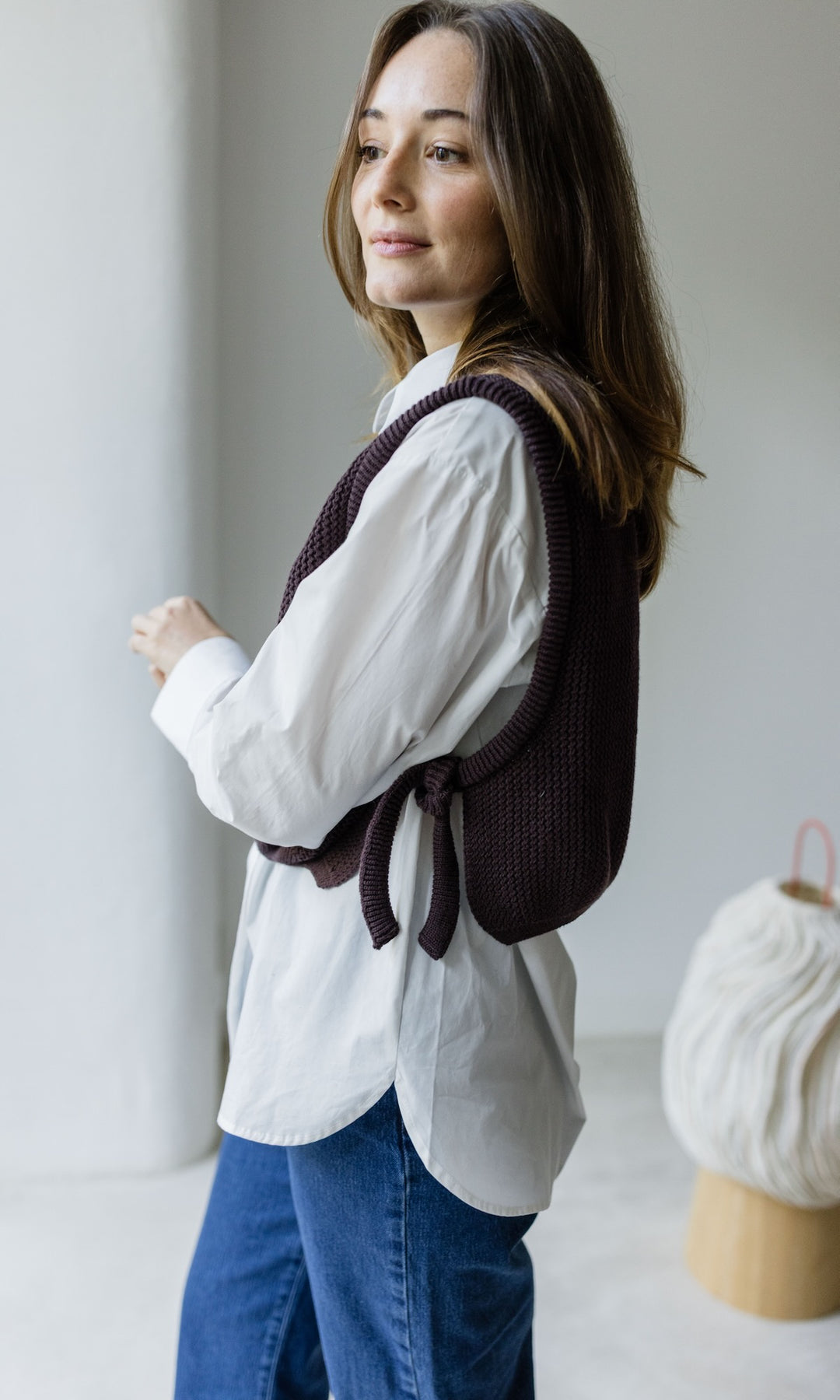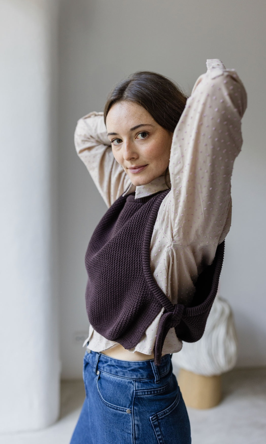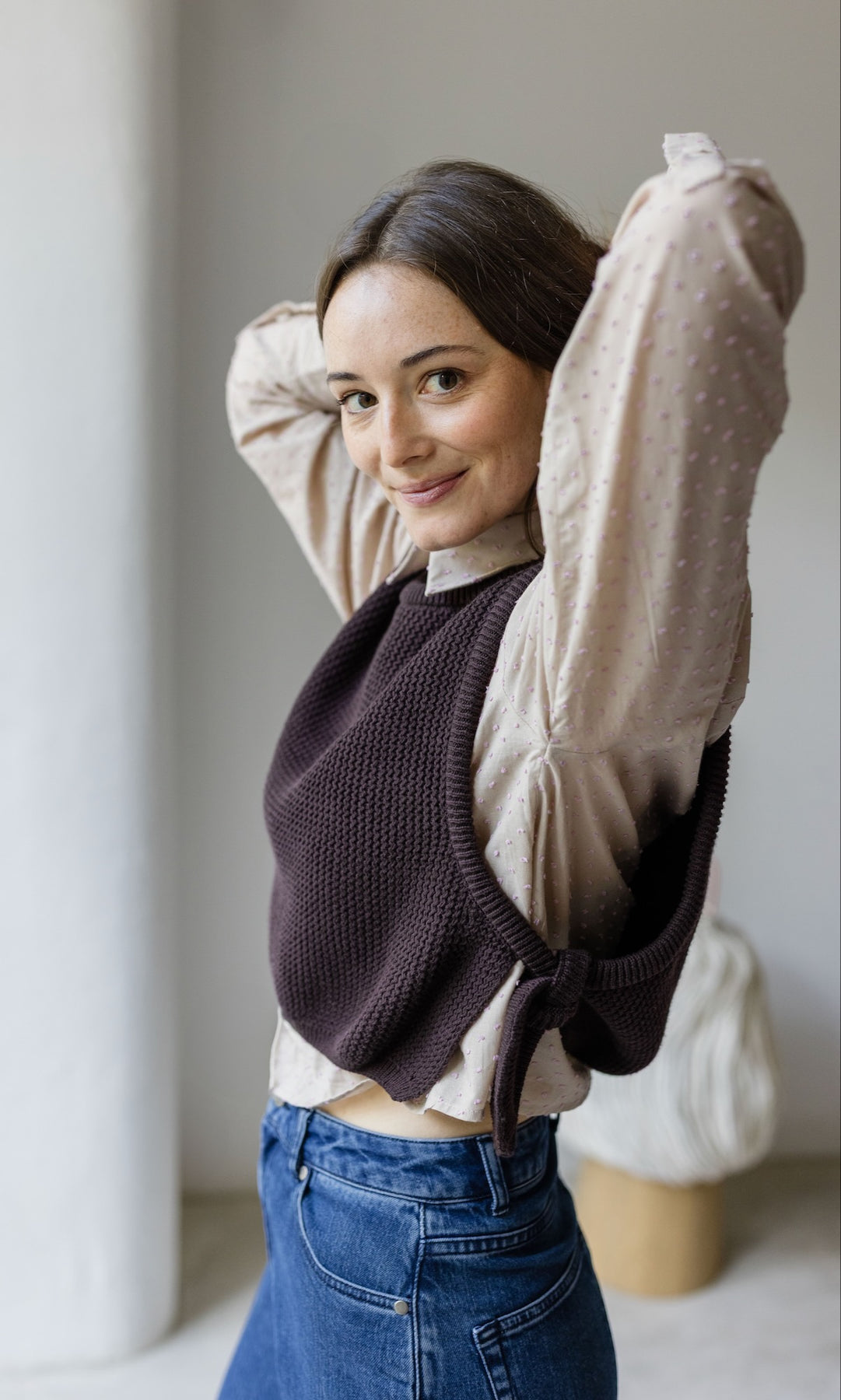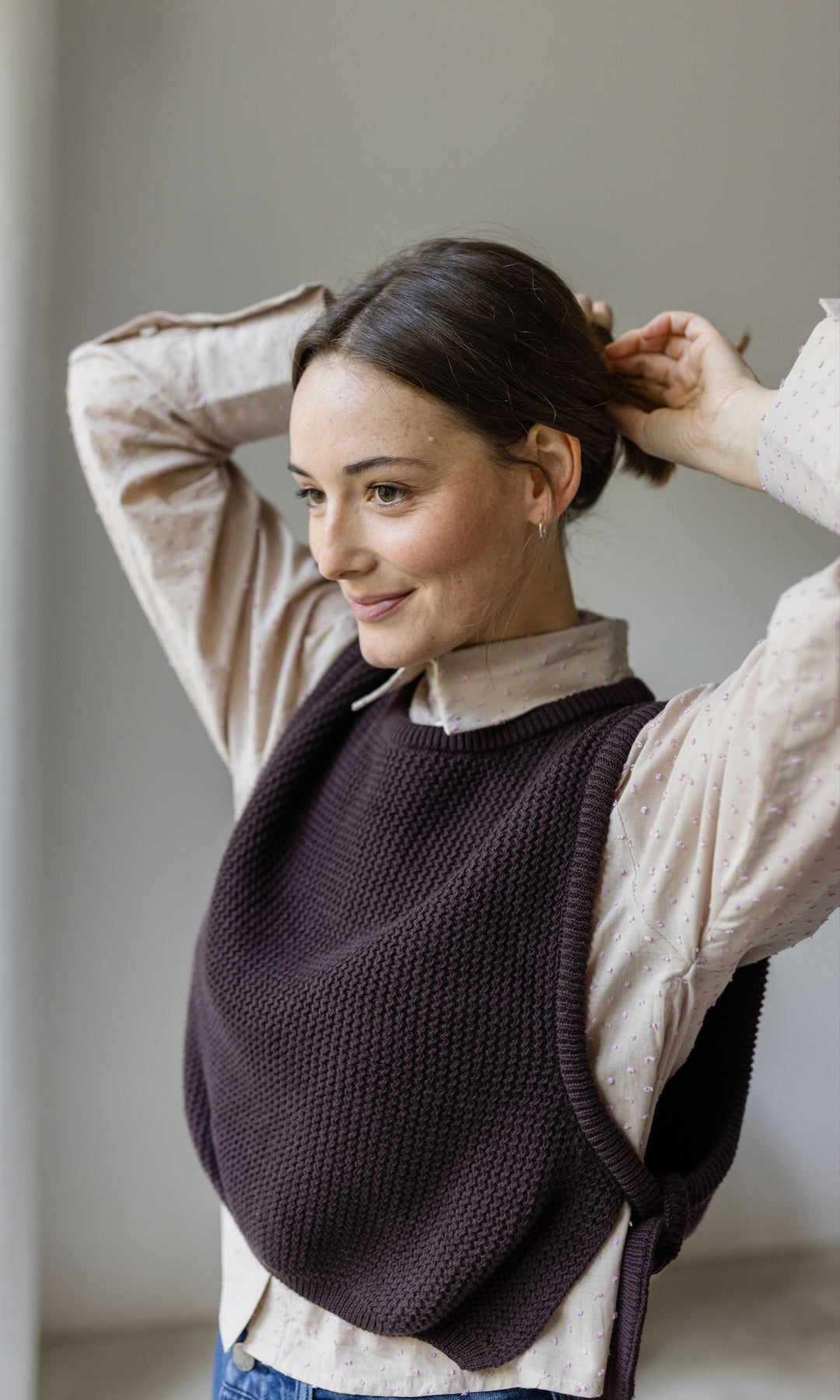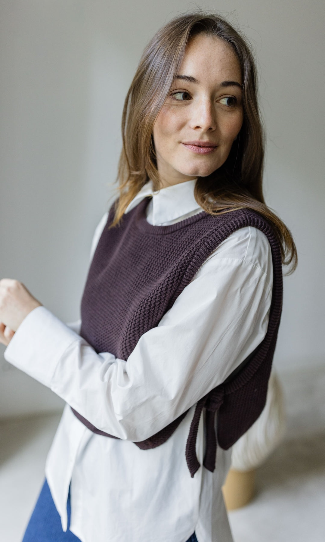 kDieser wundervolle Strickpullunder mit Rundhals aus weicher Bio-Baumwolle wird in kleiner Auflage in einer familiengeführten Textilmanufaktur gefertigt. Die seitlichen Bänder könnt ihr individuell schnüren und knoten und den Pullunder so an eure Bedürfnisse anpassen.
