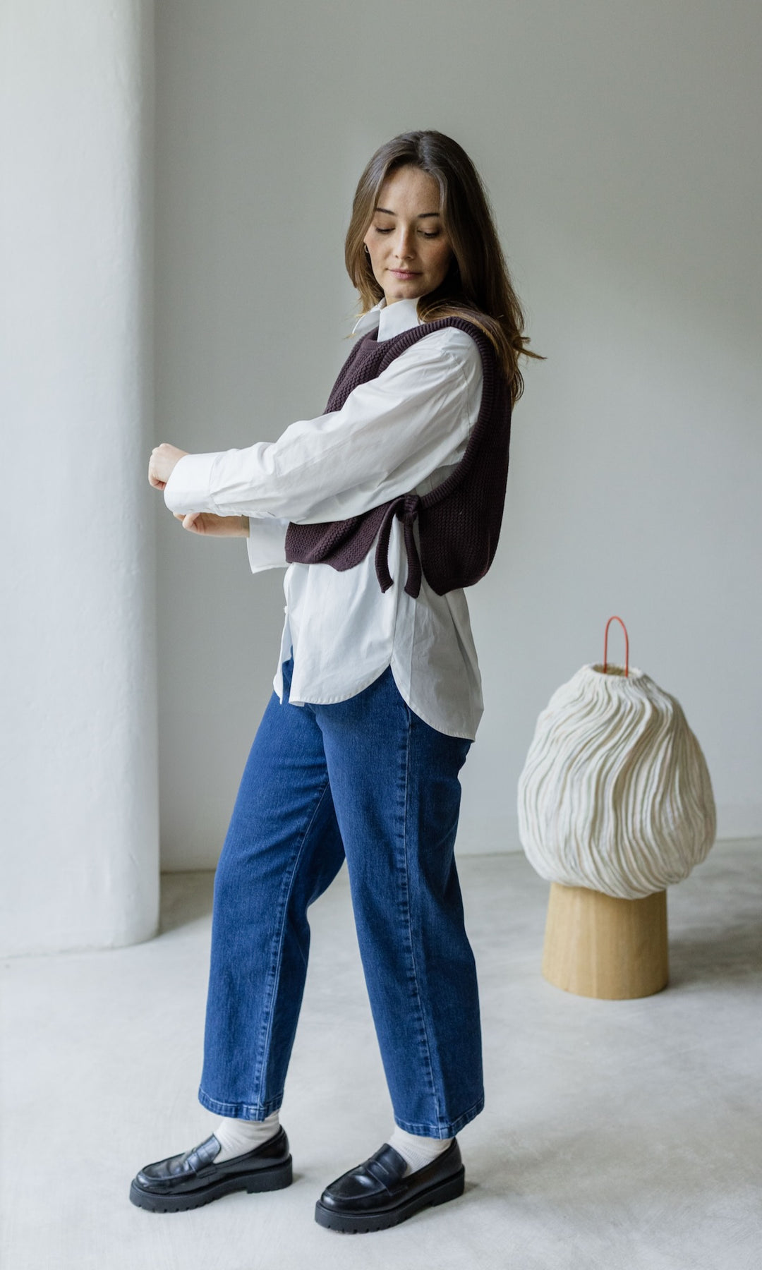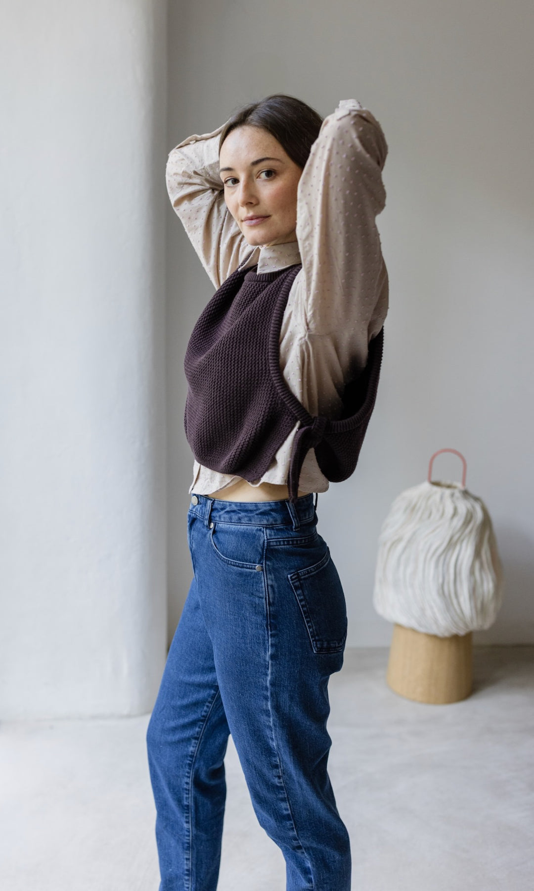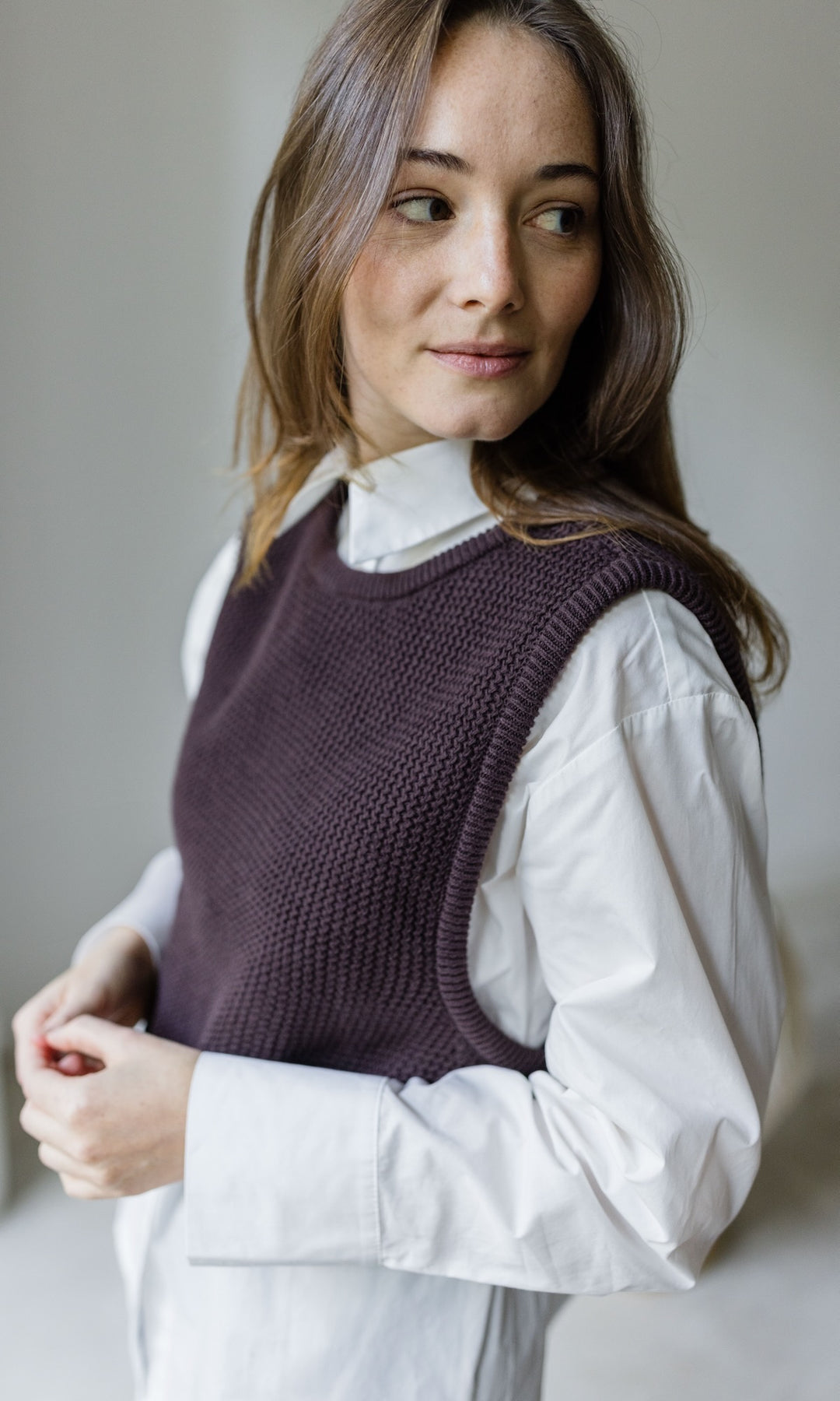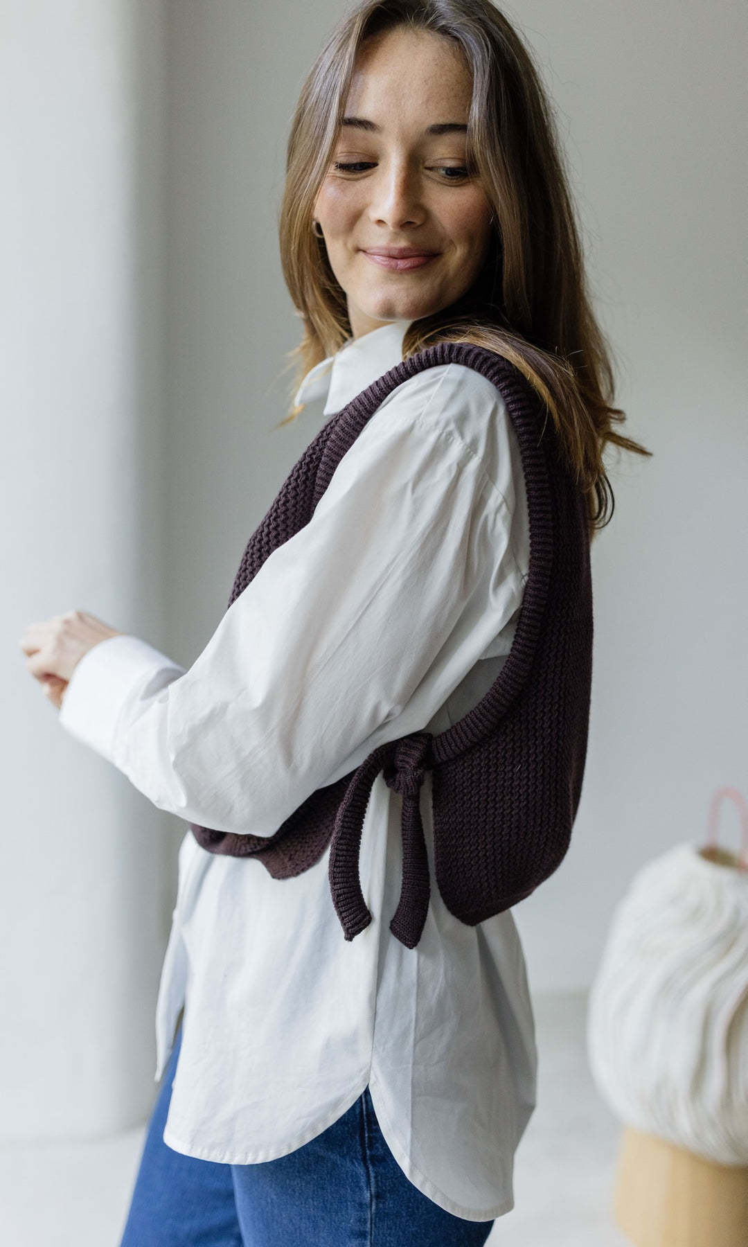 kDieser wundervolle Strickpullunder mit Rundhals aus weicher Bio-Baumwolle wird in kleiner Auflage in einer familiengeführten Textilmanufaktur gefertigt. Die seitlichen Bänder könnt ihr individuell schnüren und knoten und den Pullunder so an eure Bedürfnisse anpassen.
