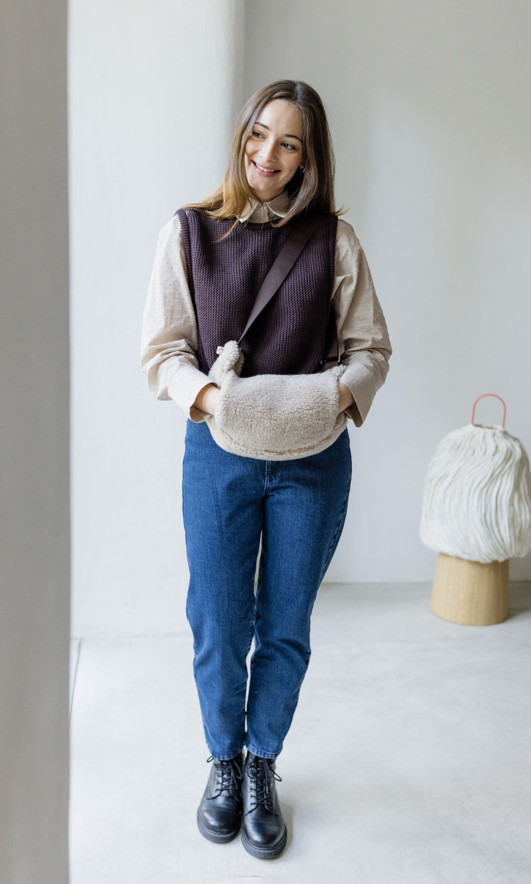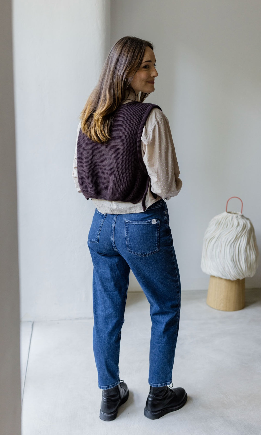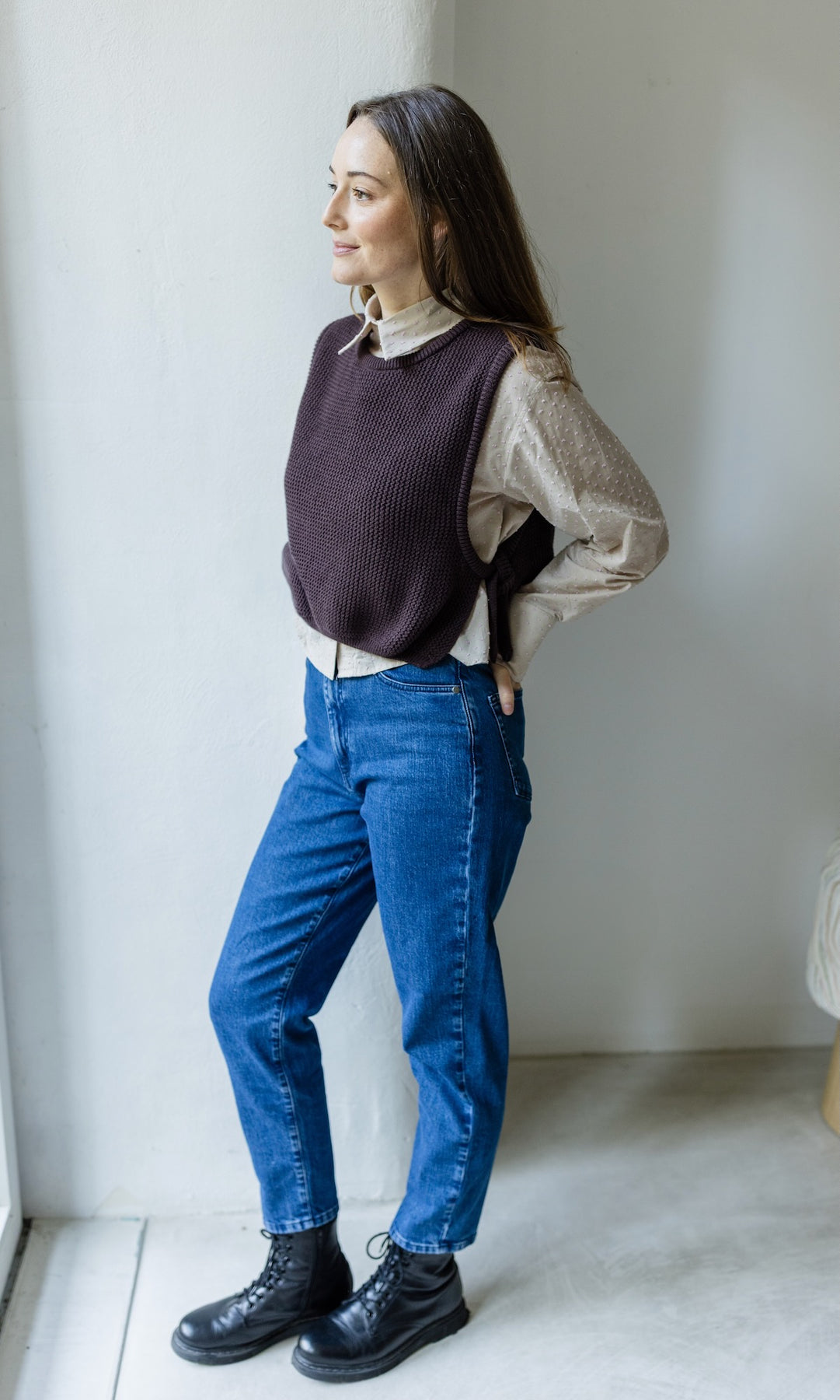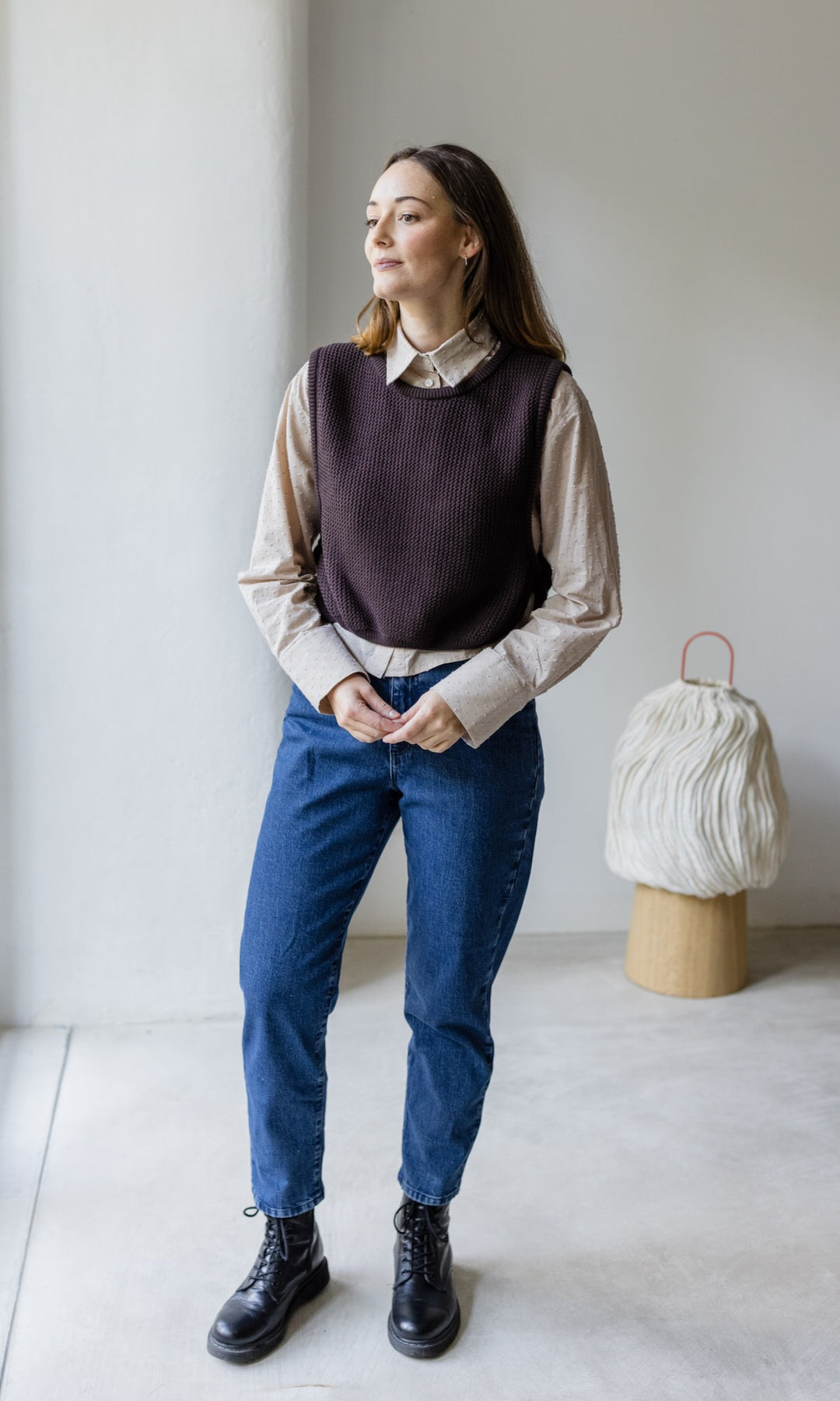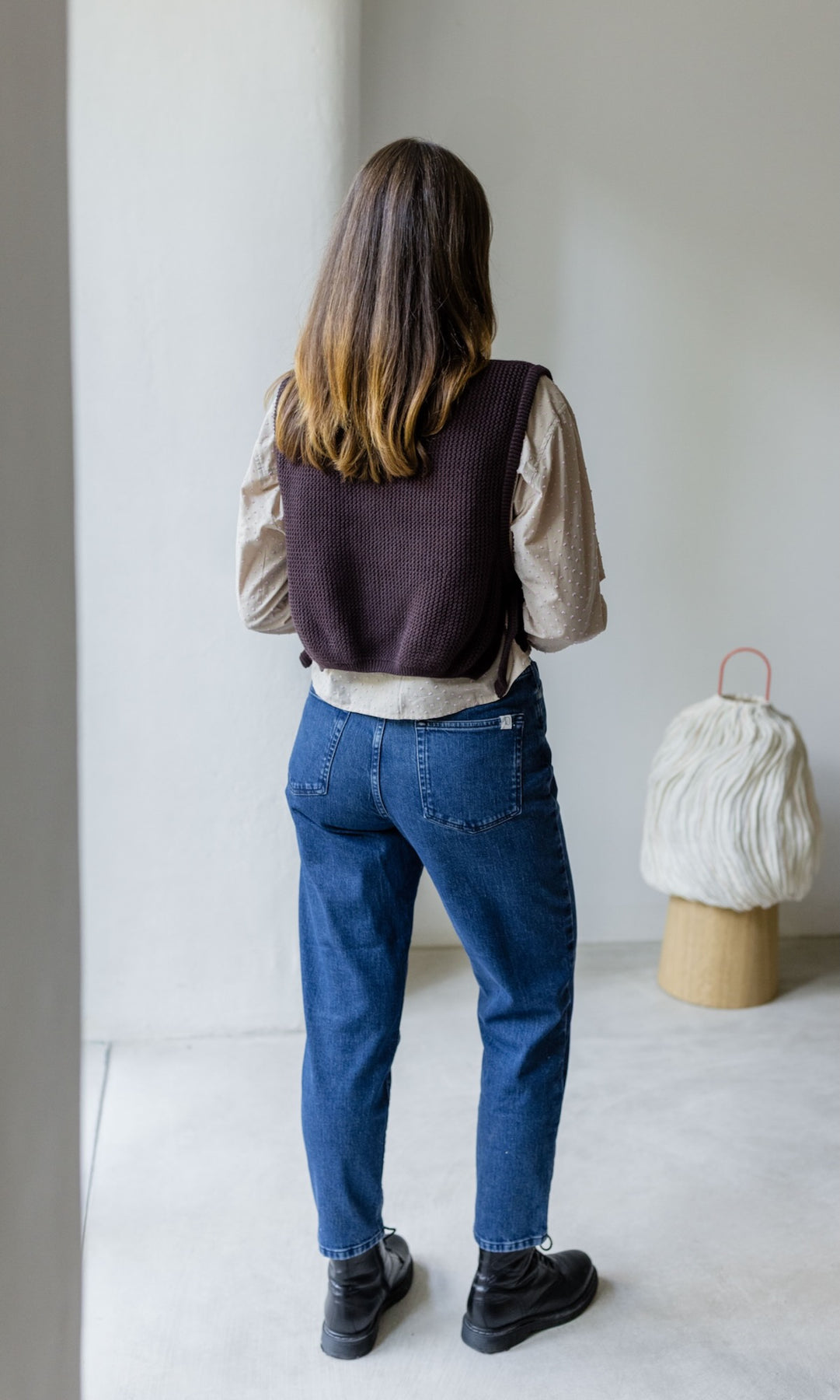 kDieser wundervolle Strickpullunder mit Rundhals aus weicher Bio-Baumwolle wird in kleiner Auflage in einer familiengeführten Textilmanufaktur gefertigt. Die seitlichen Bänder könnt ihr individuell schnüren und knoten und den Pullunder so an eure Bedürfnisse anpassen.