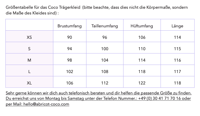 Sehr gerne können wir dich telefonisch beraten und dir helfen die passende Größe zu finden. Du erreichst uns unter: +49 (0) 30 41 71 70 16 oder schreibe uns eine Mail an hello@abricot-coco.com