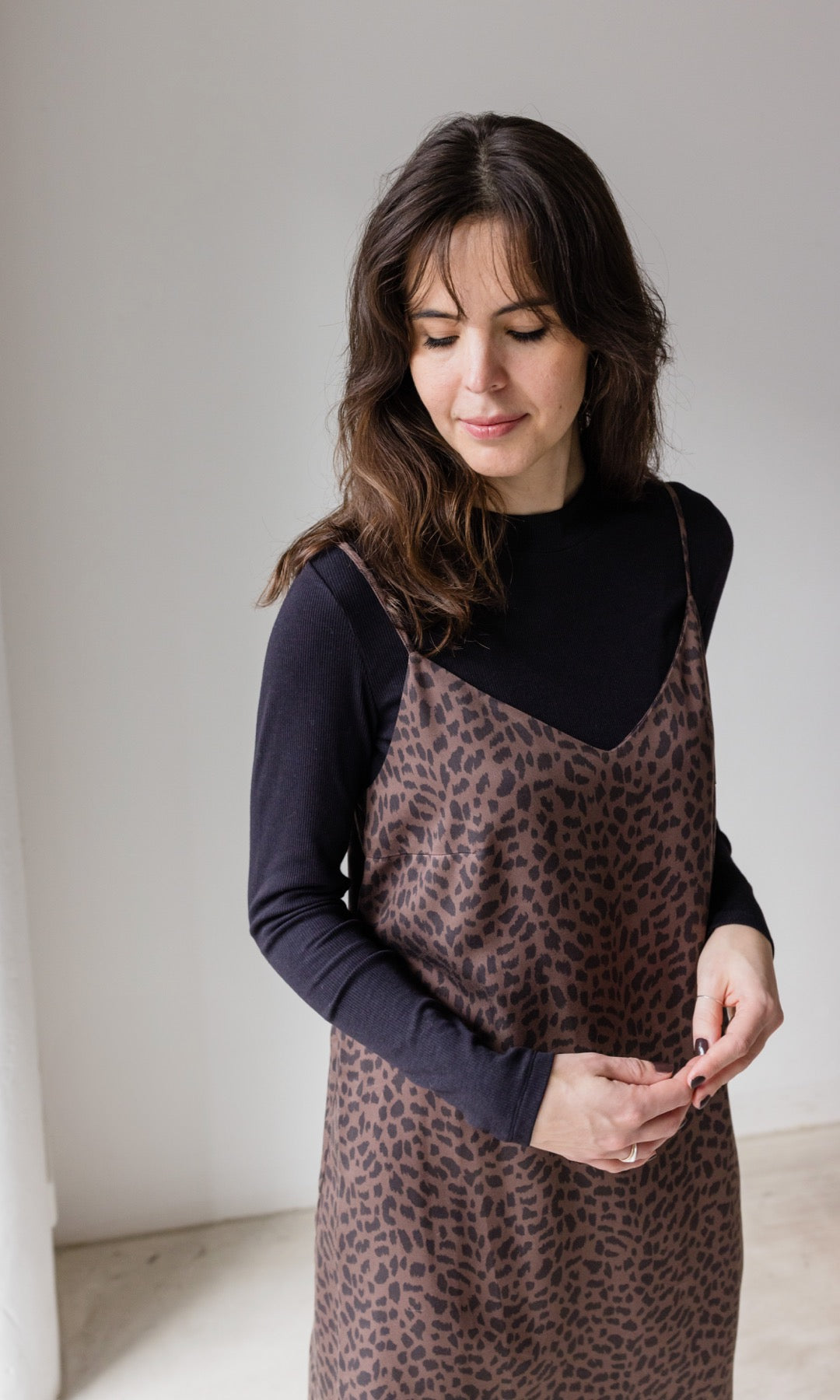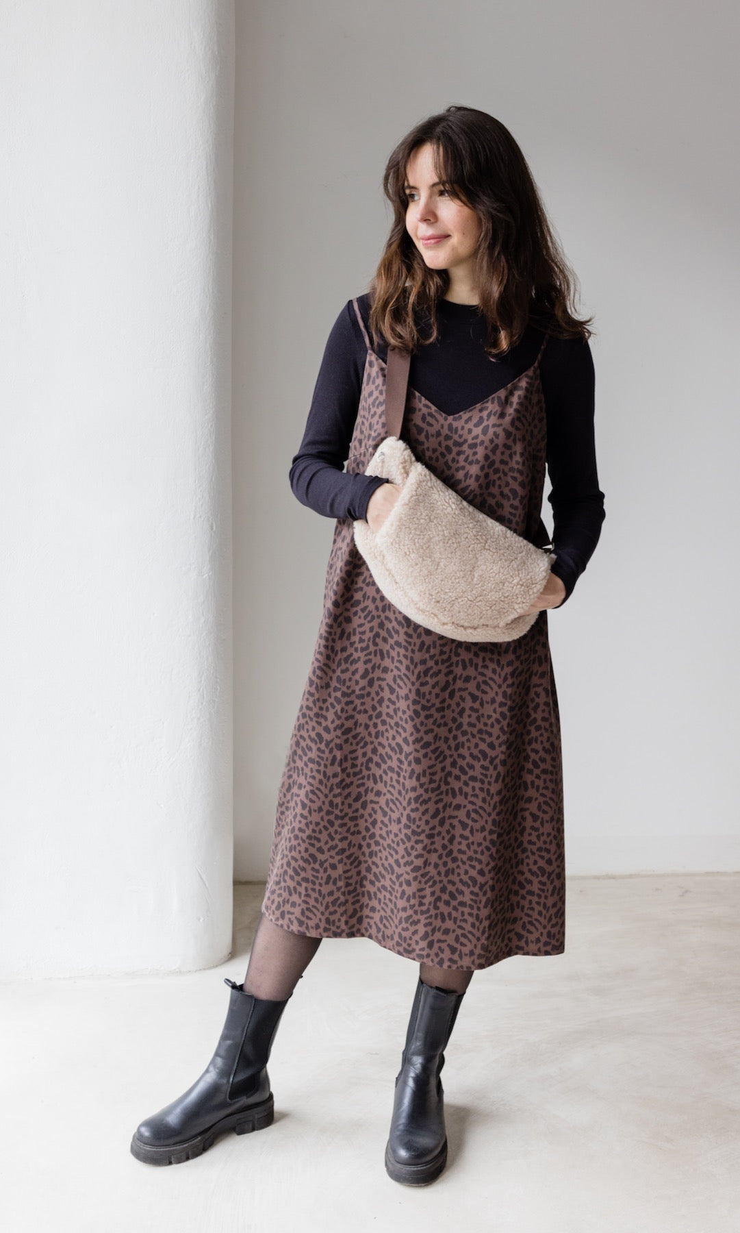 Dieses leicht fließende Trägerkleid ist ein besonderer Allrounder und kann in Kombination mit einem Pullover auch als Rock getragen werden. Die Länge der Träger ist  leicht verstellbar und kann somit individuell angepasst werden. Der stilisierte Leoparden-Print ist in der Farbe Chocolat erhältlich. Egal ob über einem Longsleeve zu kälteren Jahreszeiten oder als luftiges Sommerkleid an warmen Tagen-unser Trägerkleid ist das ganze Jahr über der perfekte Begleiter.