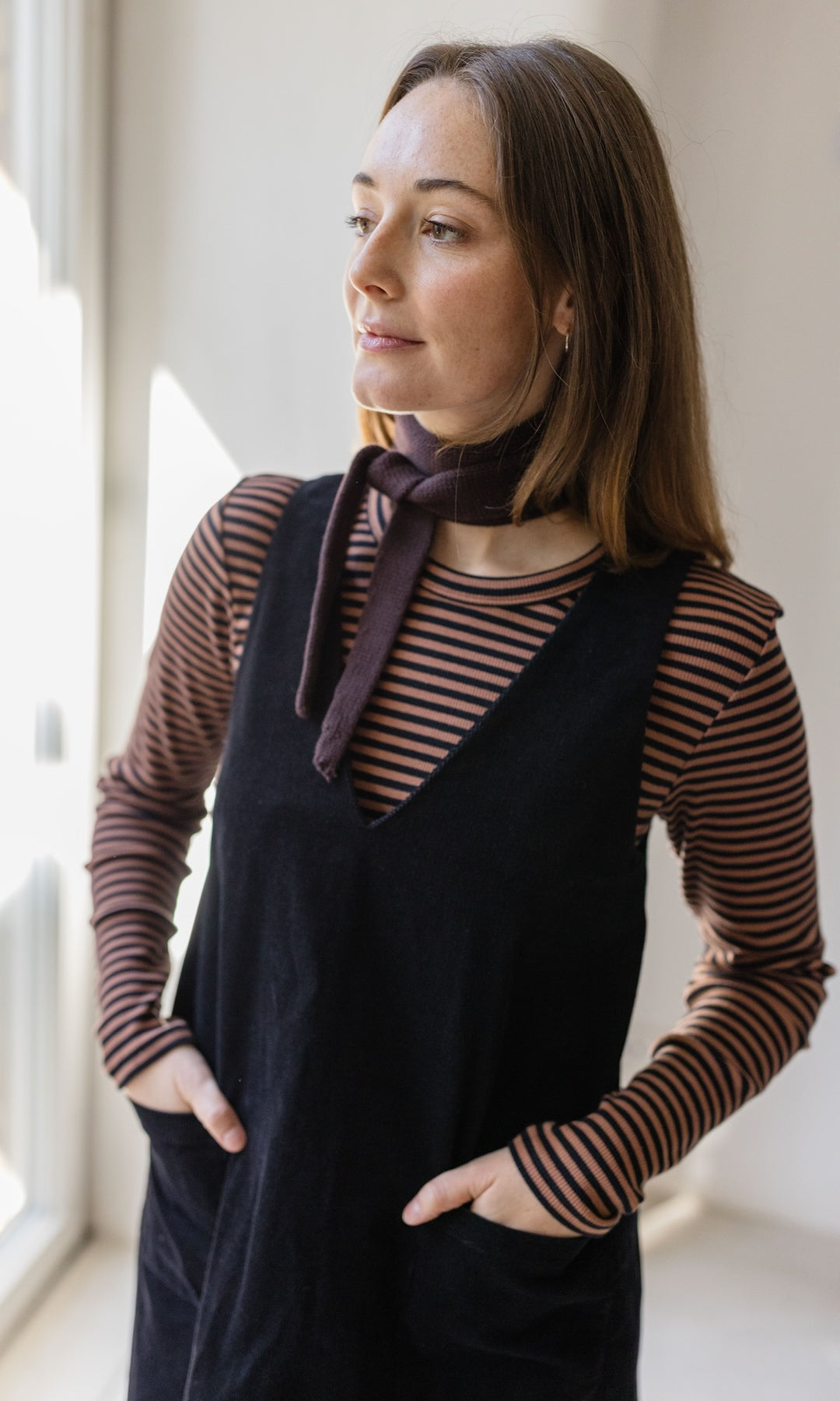 Erhältlich ist unser Kleid aus Feincord in den Farben Chocolat und Schwarz.