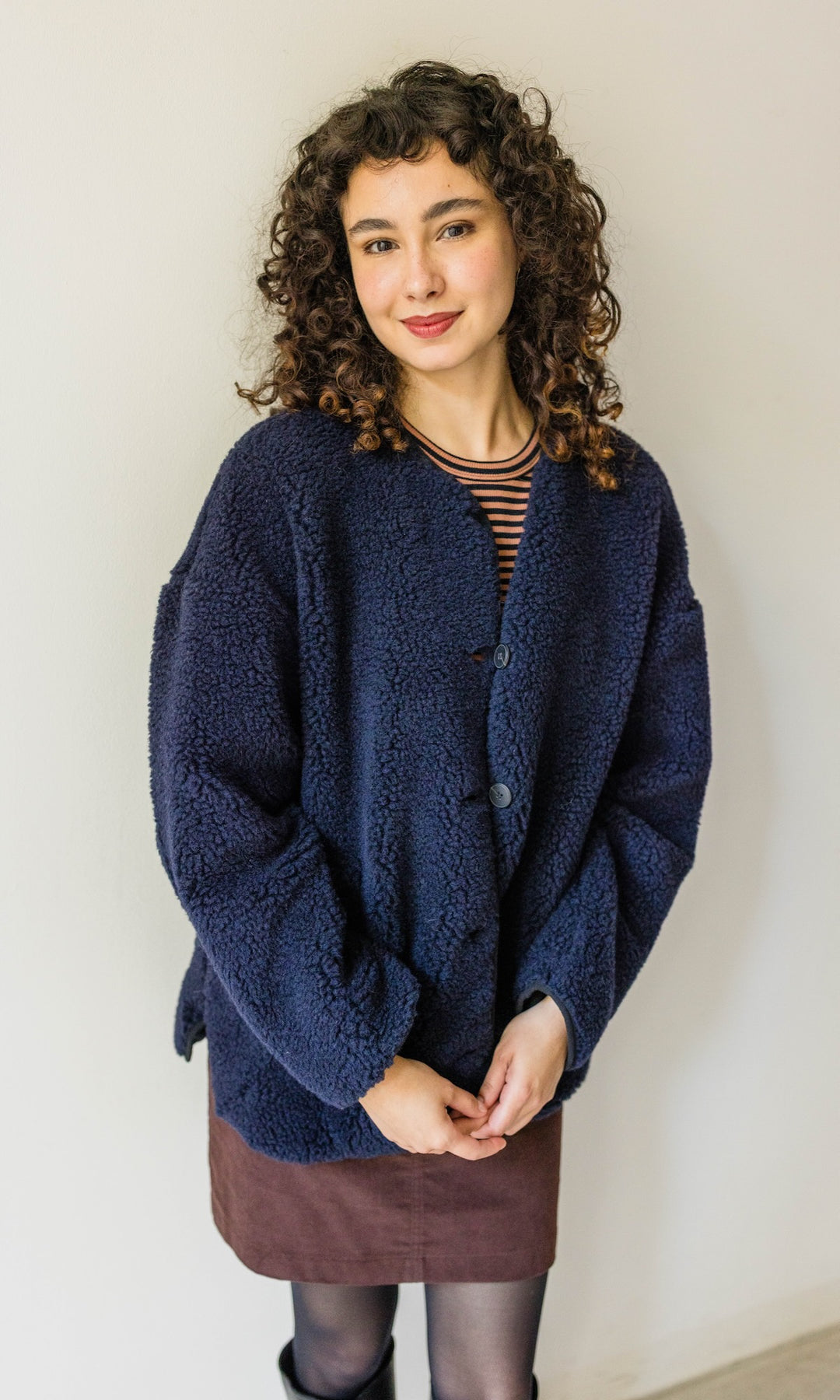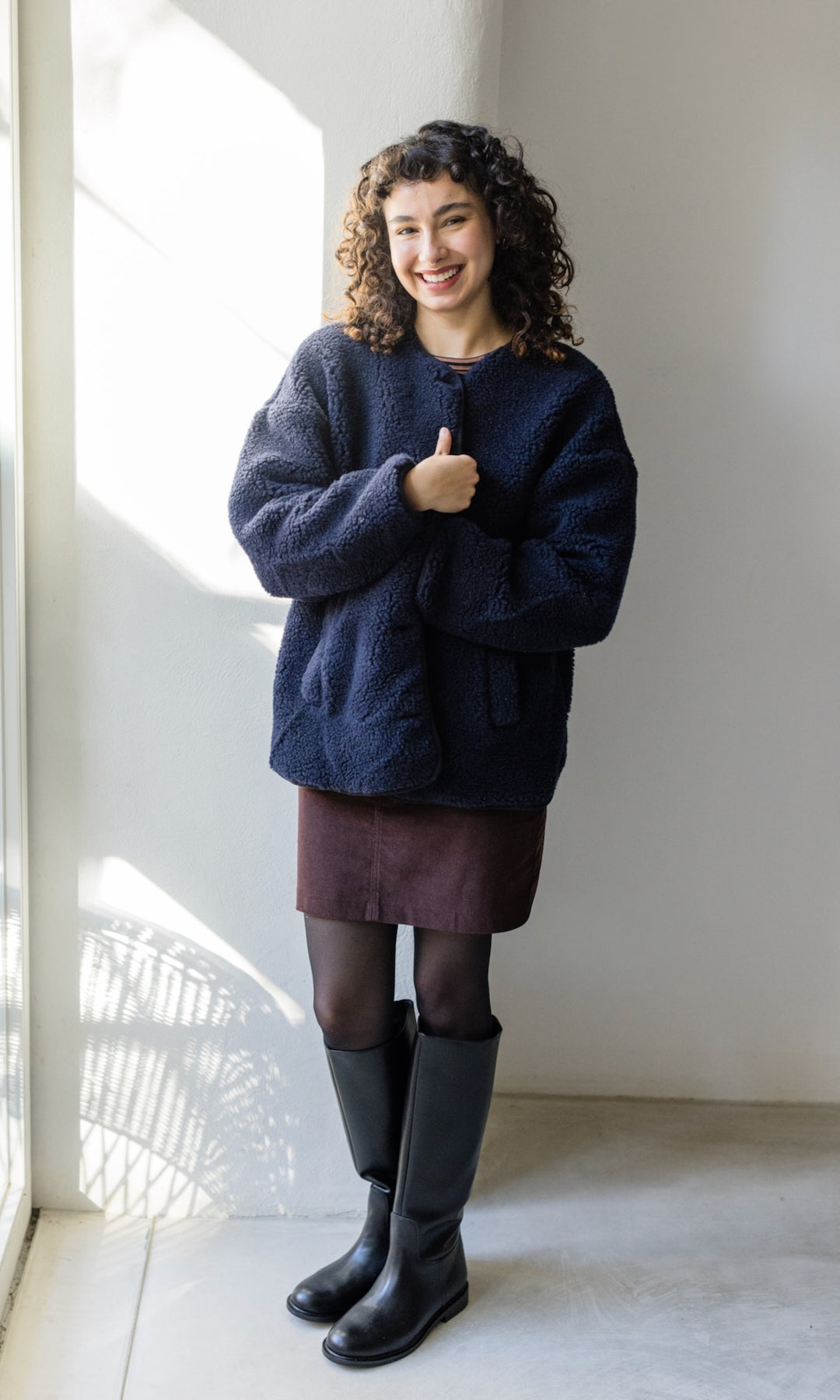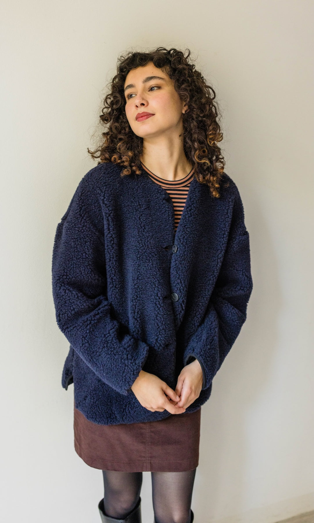Unsere besondere Jacke aus hochwertiger geschorener Schafwolle ist ideal für kalte Wintertage und lässt sich vielseitig mit unserer Mom Jeans und unseren Oberteilen kombinieren. Sie ist angenehm weich und kuschelig und kann sowohl geschlossen, als auch offen getragen werden. Der moderne Schnitt und die perfekte Länge, machen unsere Jacke zu einem besonderen Allrounder. Erhältlich ist sie in der Farbe Blau und einem zeitlosen Creme Ton.