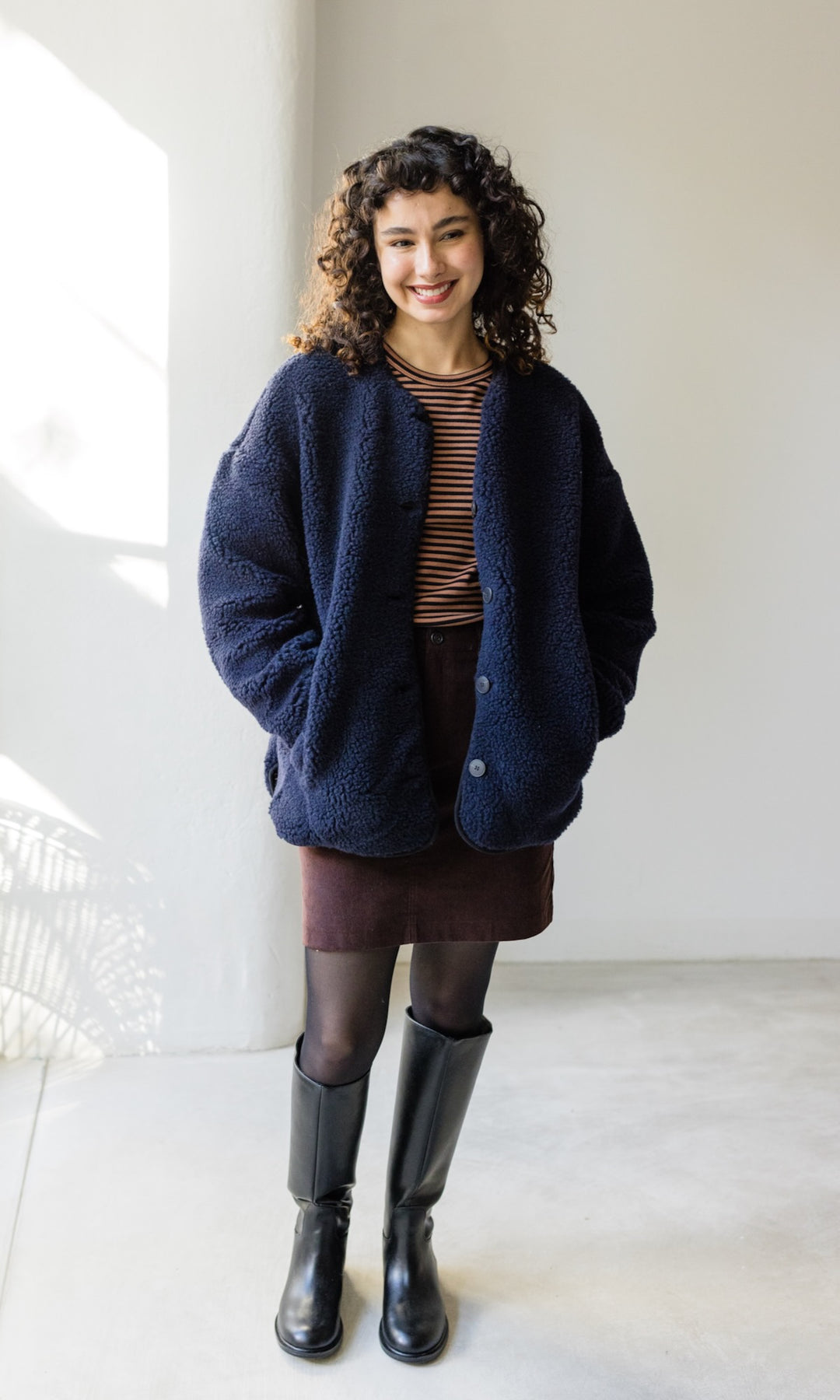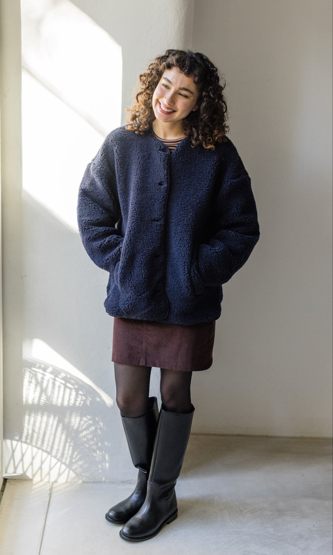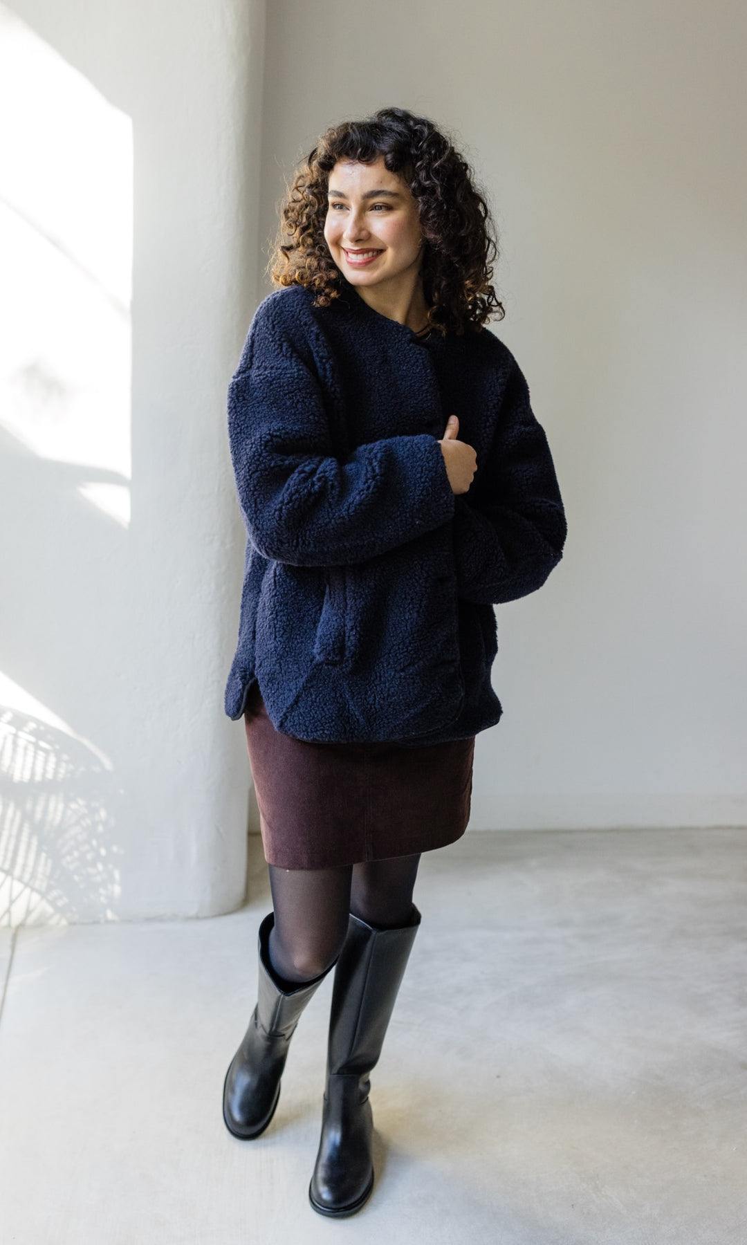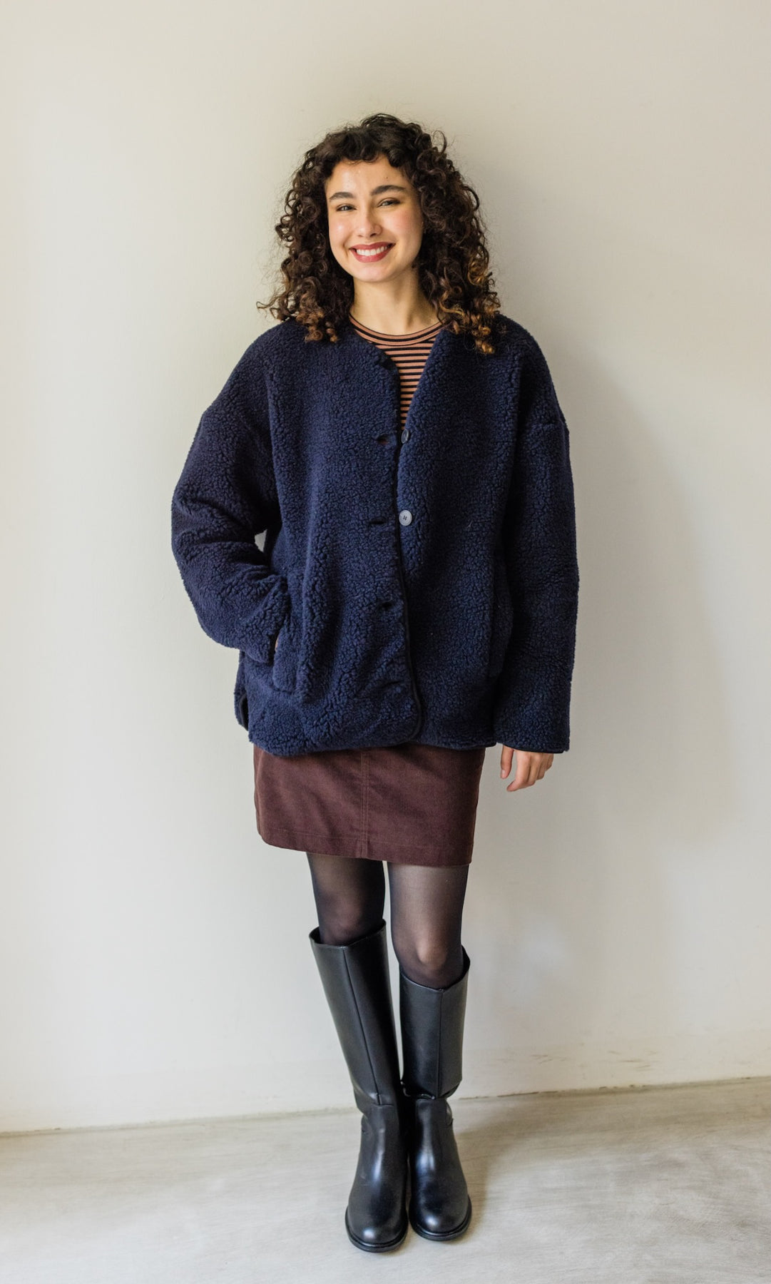Unsere besondere Jacke aus hochwertiger geschorener Schafwolle ist ideal für kalte Wintertage und lässt sich vielseitig mit unserer Mom Jeans und unseren Oberteilen kombinieren. Sie ist angenehm weich und kuschelig und kann sowohl geschlossen, als auch offen getragen werden. Der moderne Schnitt und die perfekte Länge, machen unsere Jacke zu einem besonderen Allrounder. Erhältlich ist sie in der Farbe Blau und einem zeitlosen Creme Ton.