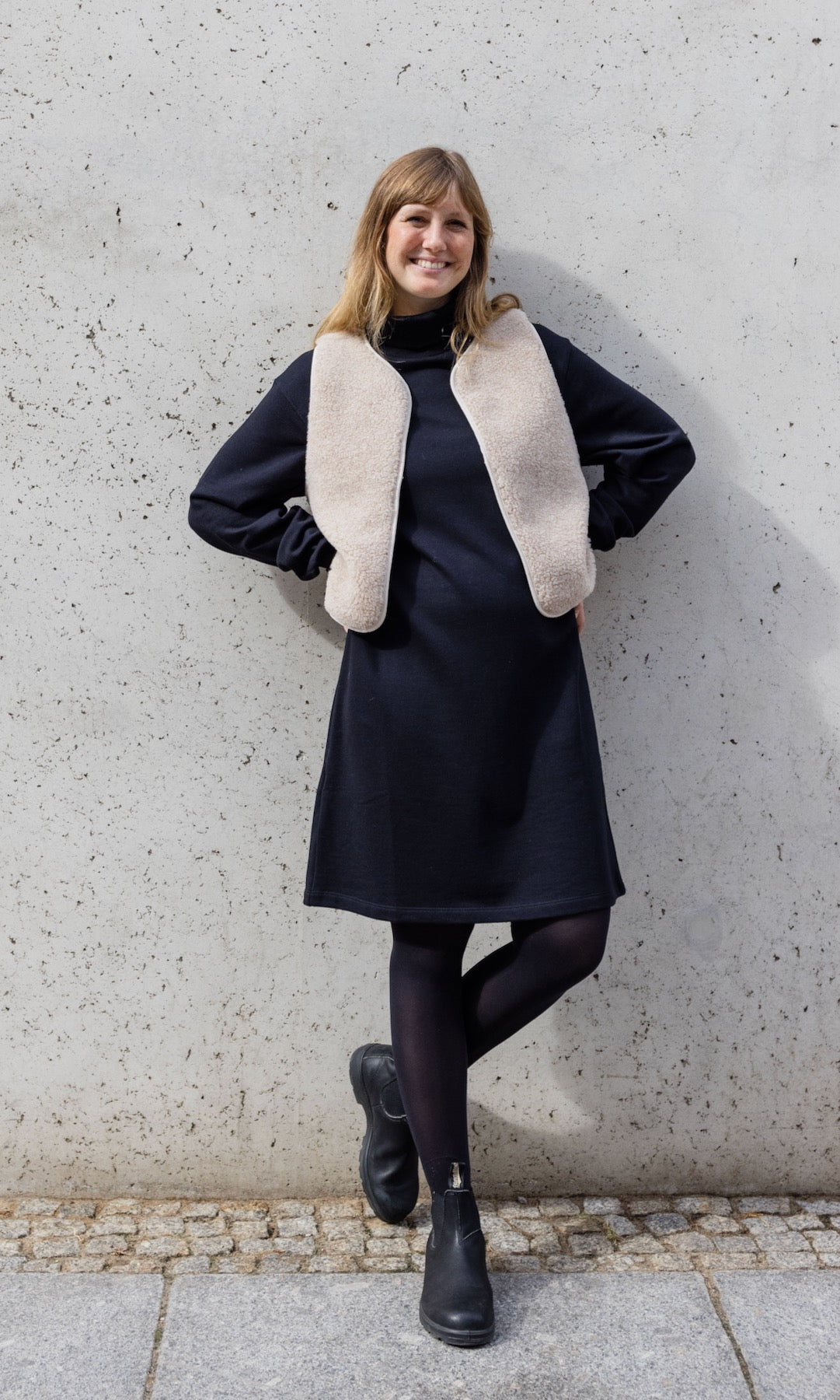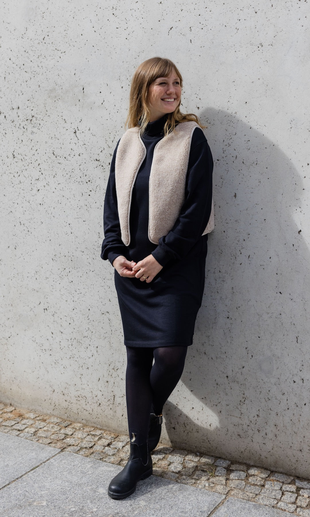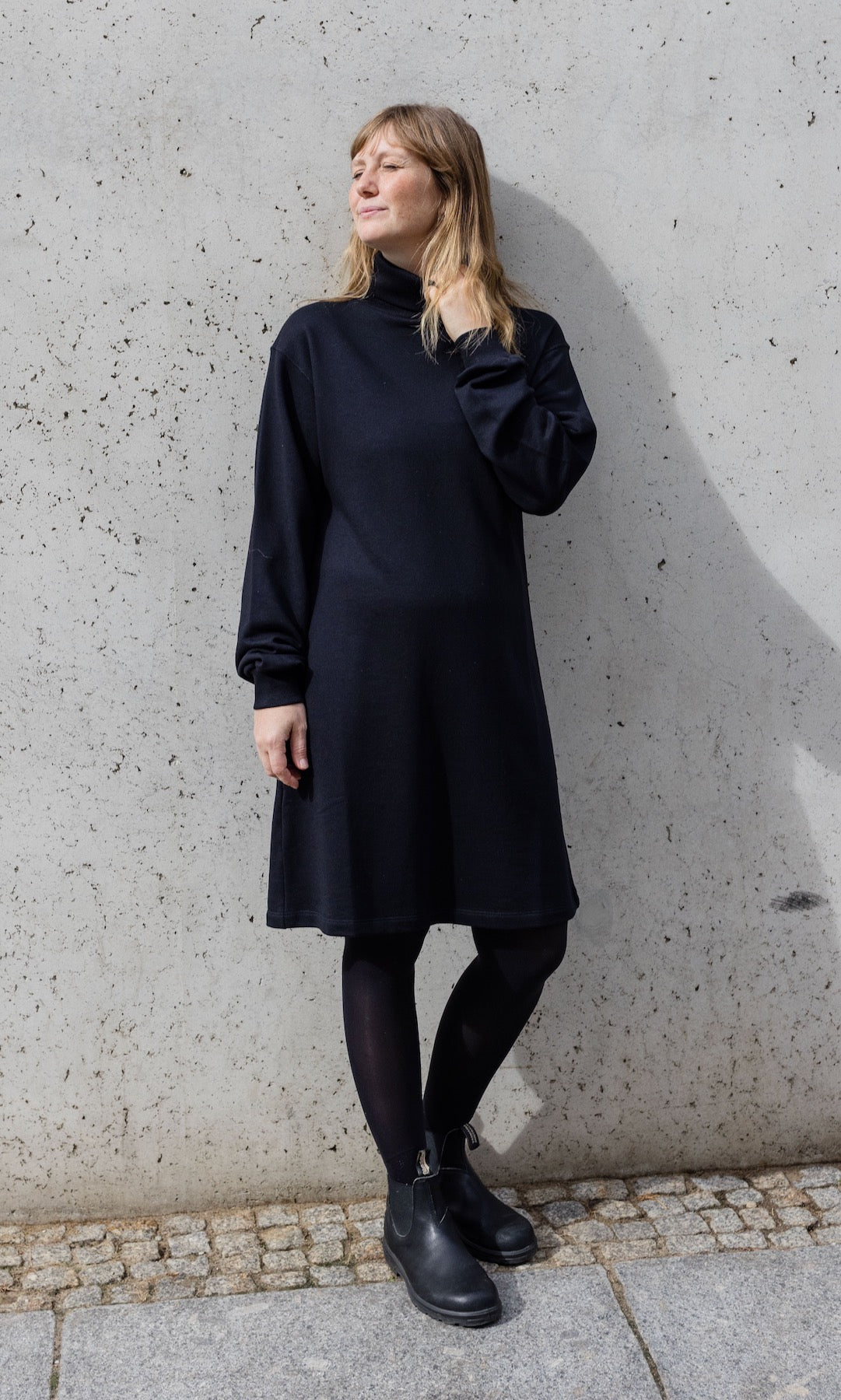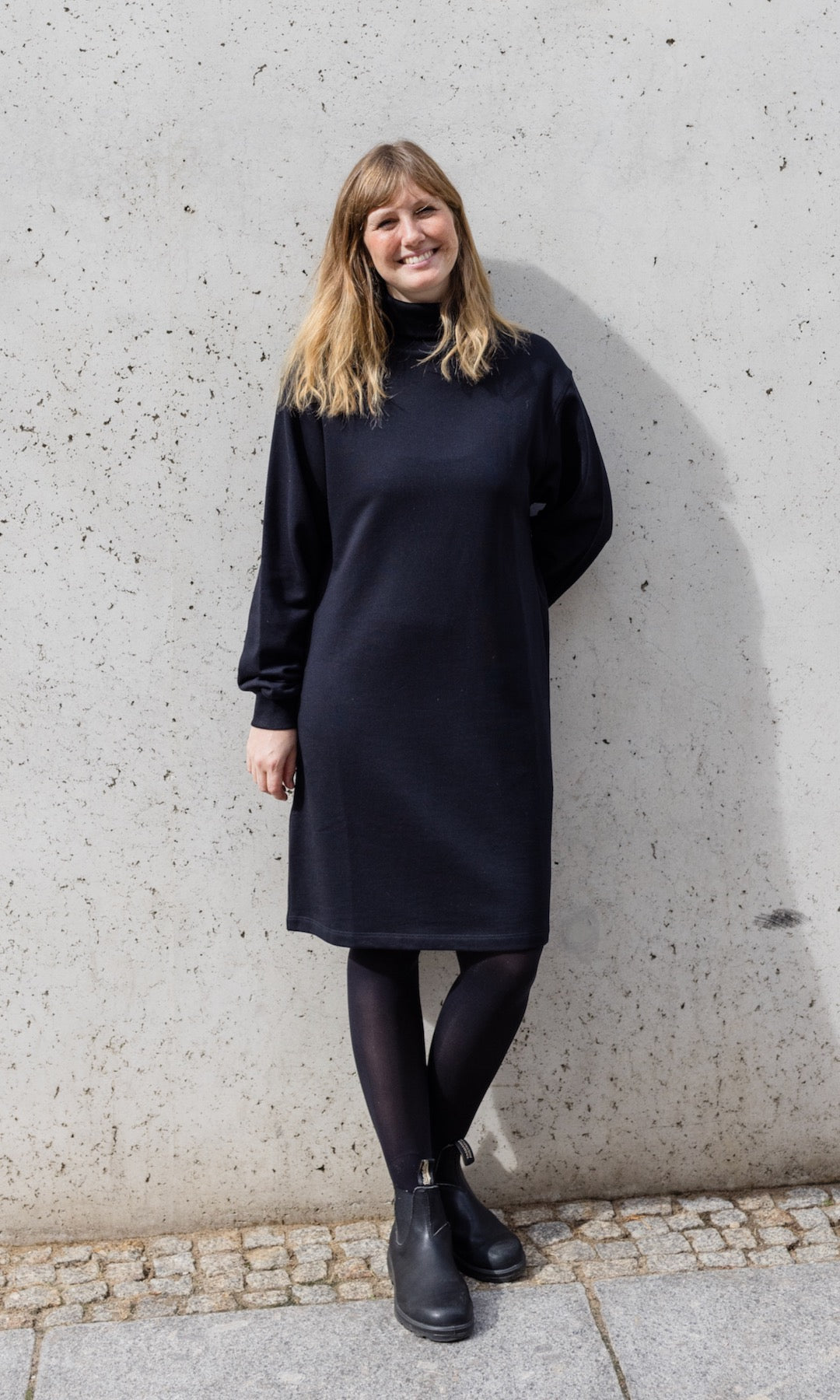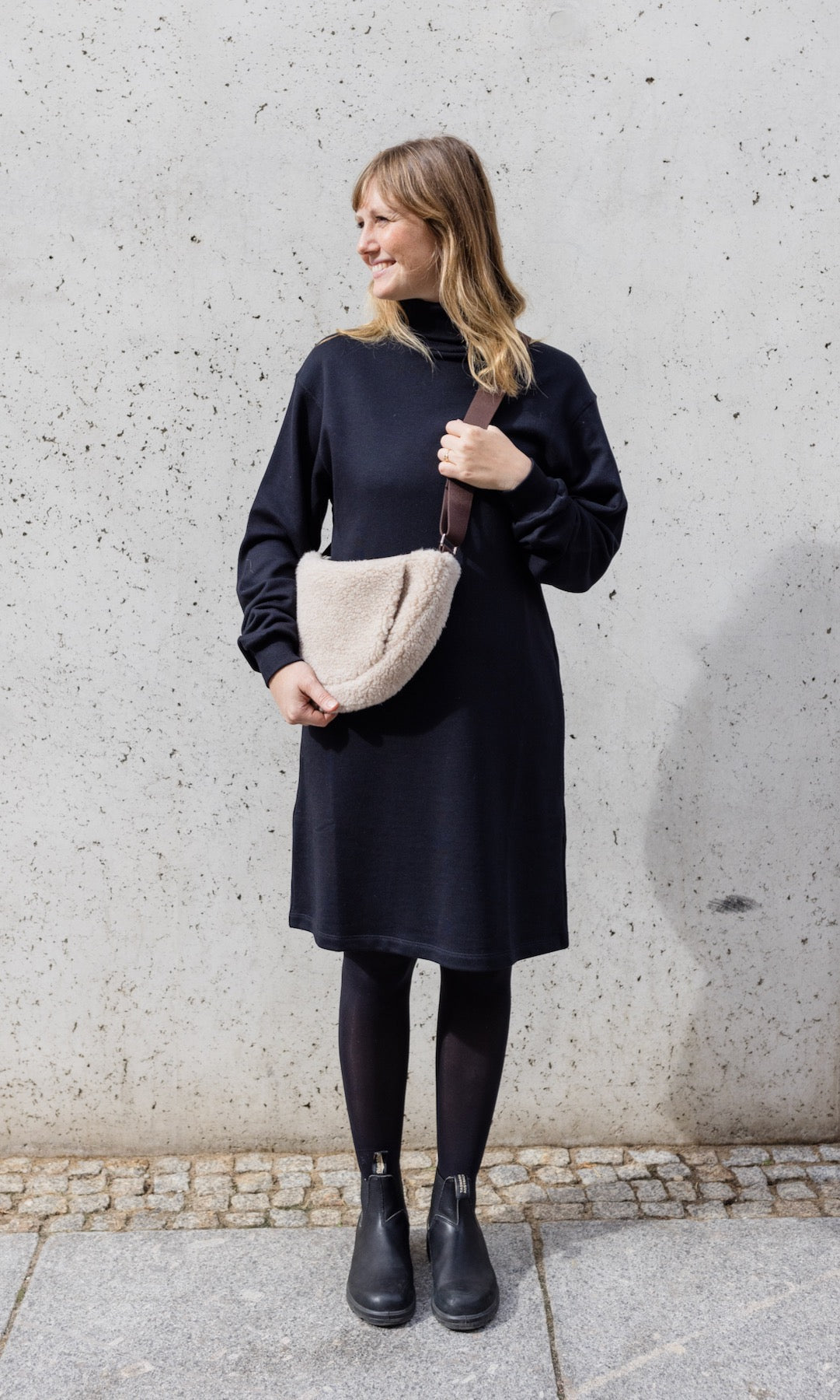 Das Kleid ist aus einem schweren, dicken Stoff und fühlt sich toll an. Etwas für kühlere Tage. Ich trage normalerweise bei der Marke immer M. Könnte mir bei dem Kleid vorstellen, dass auch S gut passen könnte. In M ist das Kleid definitiv oversized.