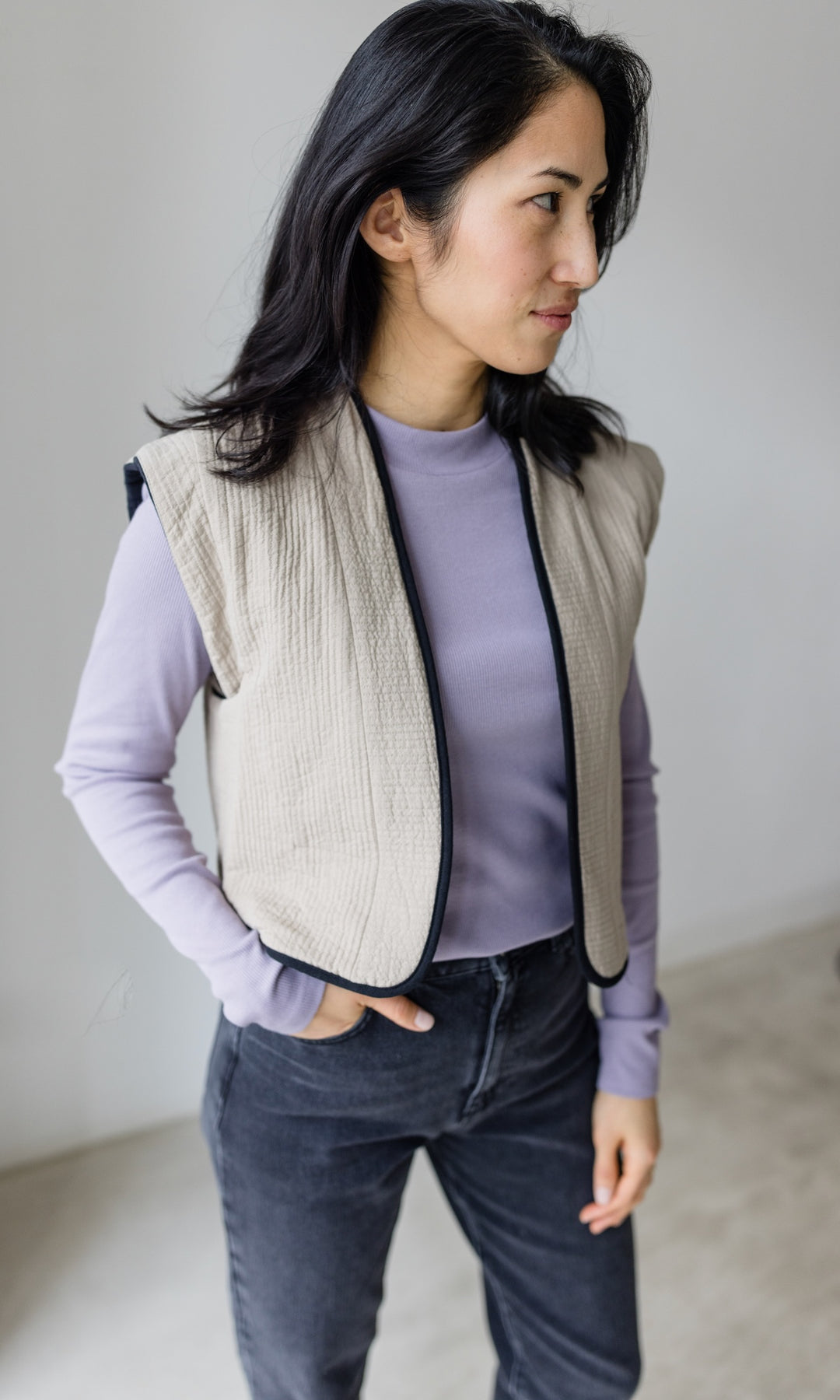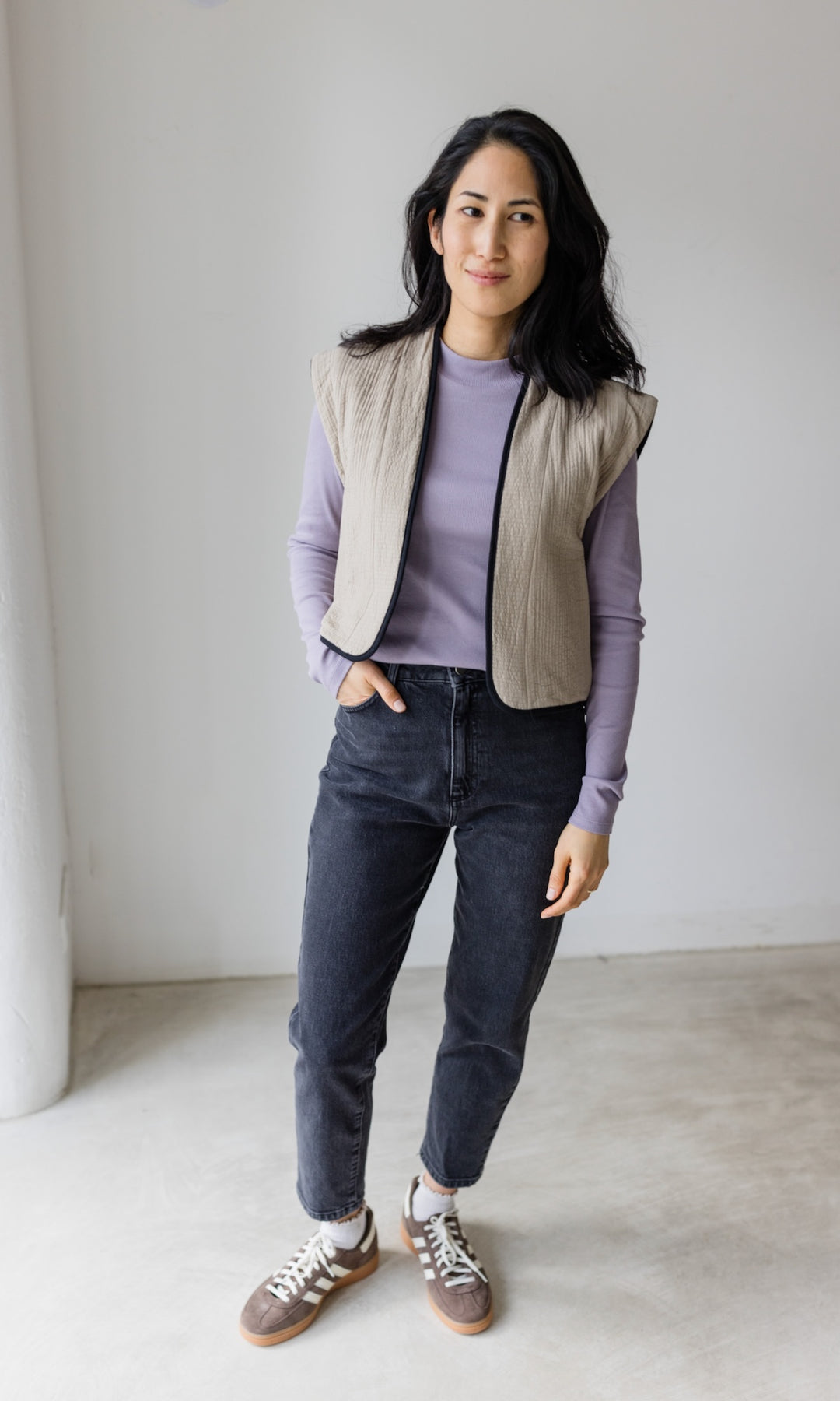 Stillshirt lang mit Rollkragen in flieder kombiniert mit dunkelblauer Jeans, heller Steppweste und Sneakers vor grauer Wand von vorne Blick gerade