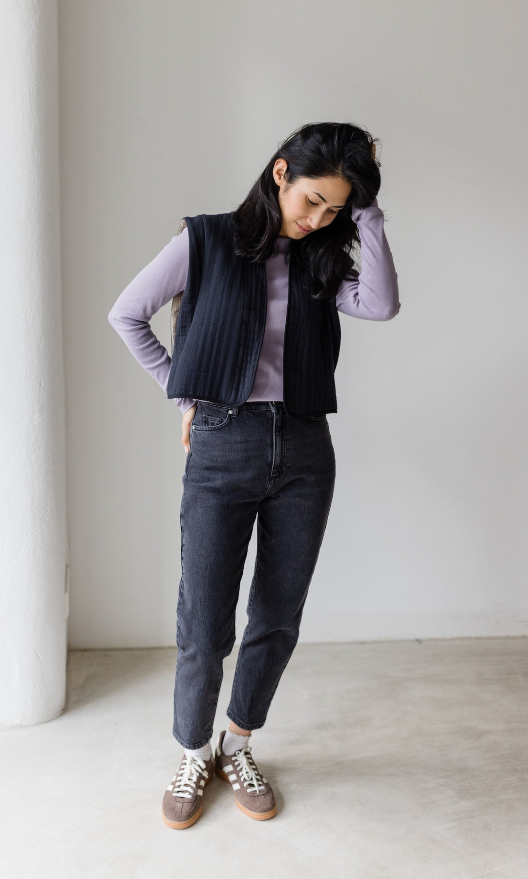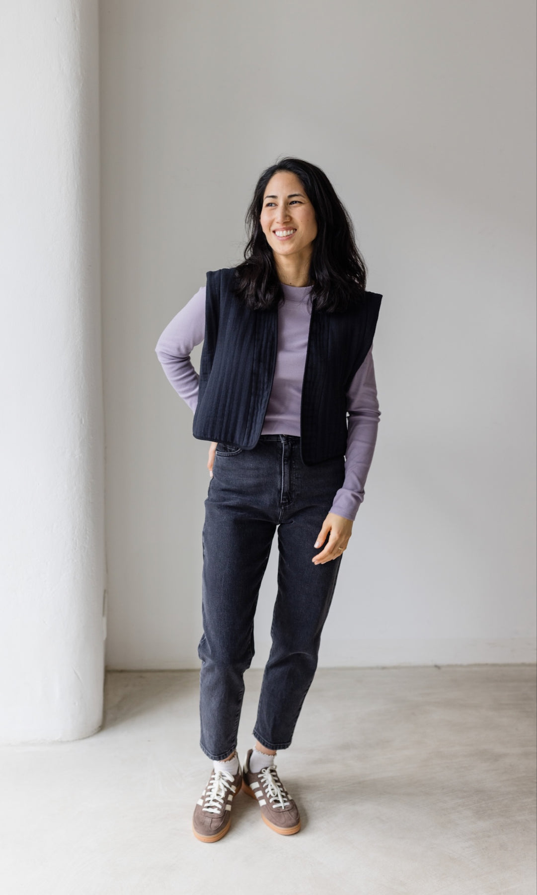 Stillshirt lang mit Rollkragen in flieder kombiniert mit dunkelblauer Jeans, dunkler Steppweste und Sneakers vor grauer Wand von vorne Blick nach unten