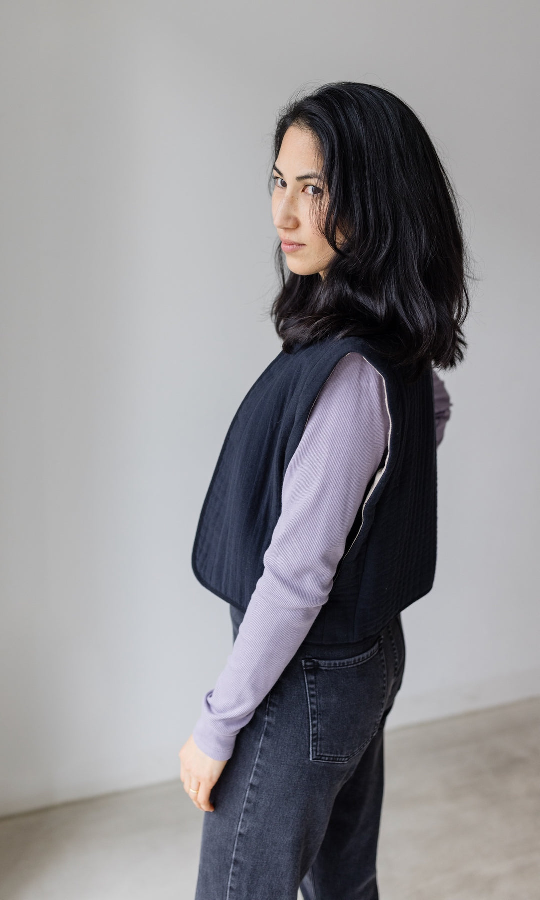 Stillshirt lang mit Rollkragen in flieder kombiniert mit dunkelblauer Jeans, dunkeler Steppweste und Sneakers vor grauer Wand von vorne Blick seitlich
