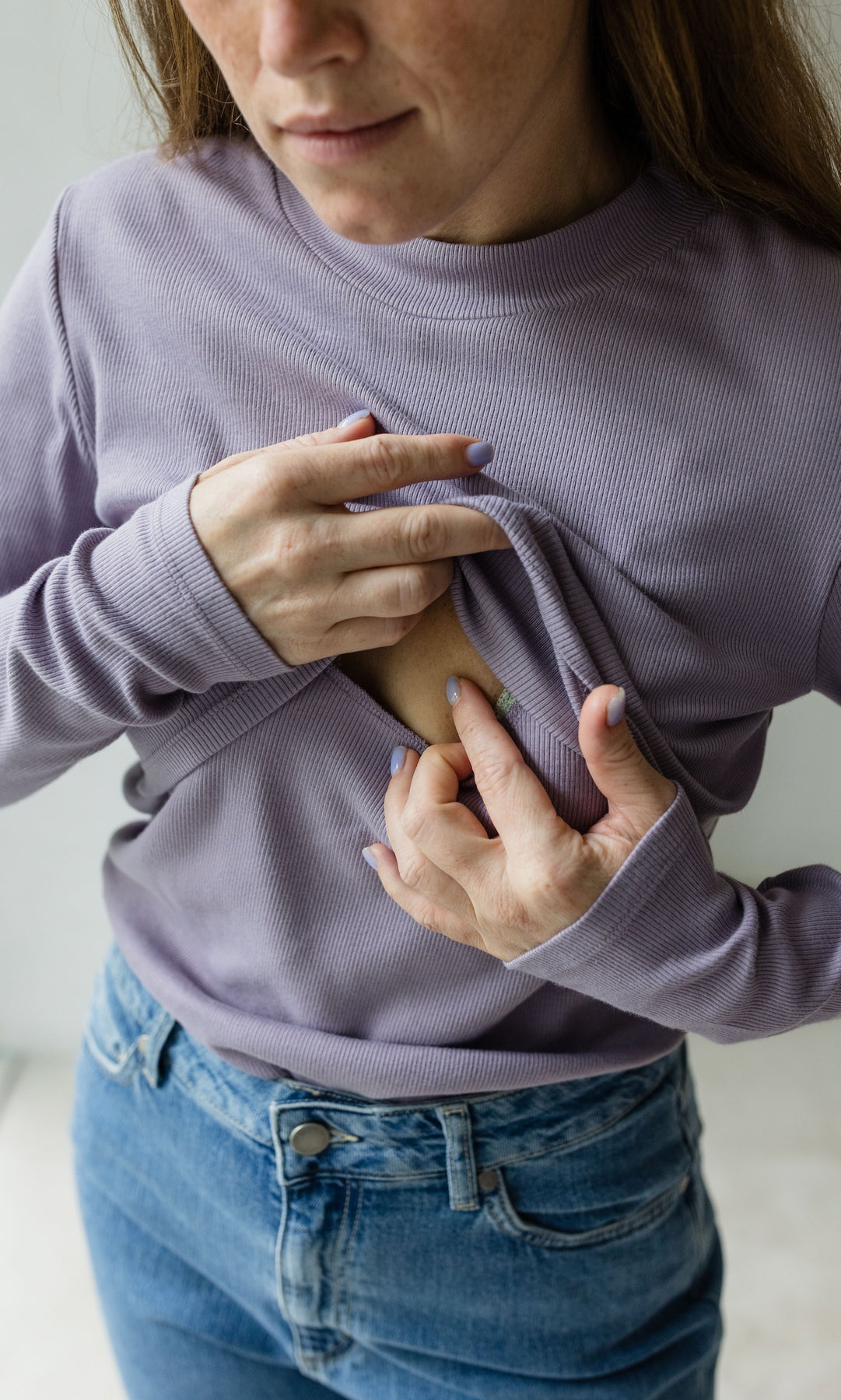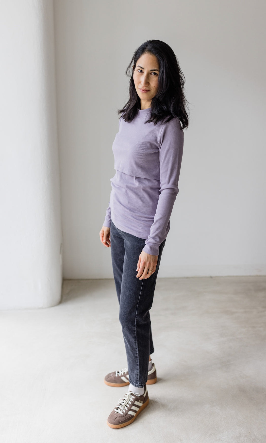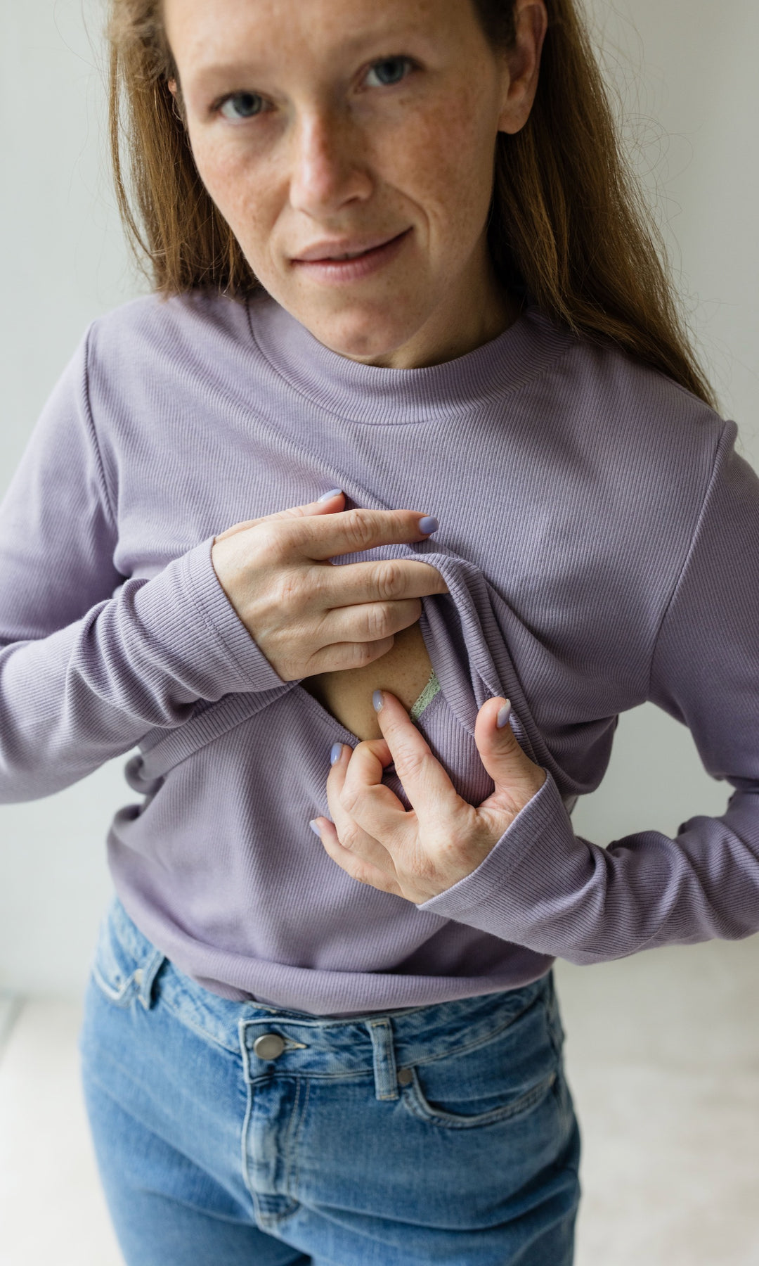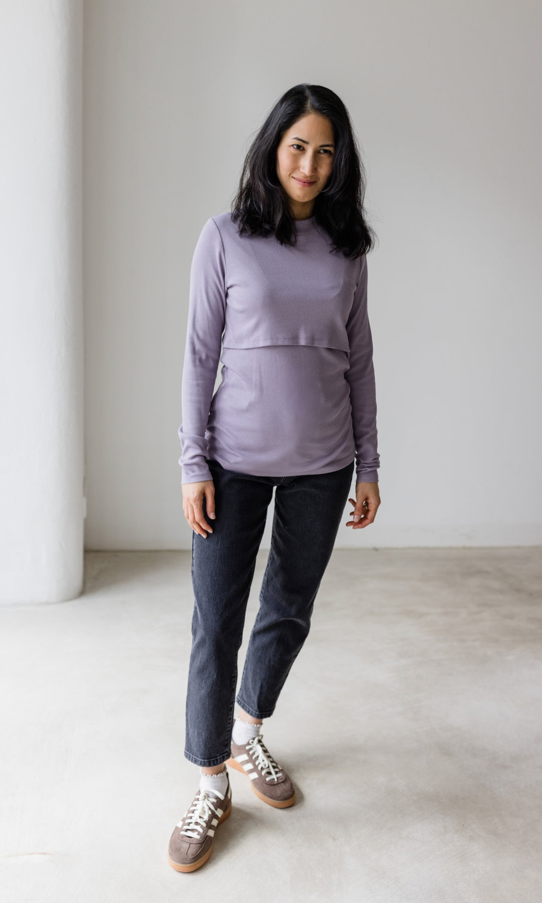 Unser Stillshirt Cléo haben wir aus einem elastischen Stoff mit feiner Rippstruktur in Flieder entworfen. Es lässt sich vielseitig kombinieren und hält dich auch als Layering-Piece unter einem dickeren Pullover schön warm. Das Shirt ist mit und ohne Stillfunktion erhältlich und ist mit seinem zeitlosen Schnitt der perfekte Begleiter für jeden Tag.