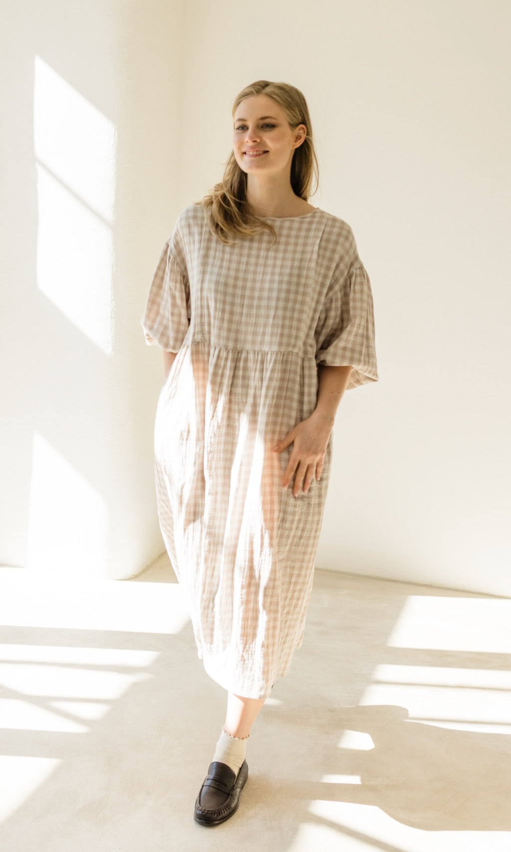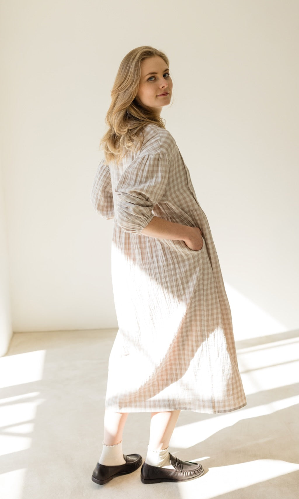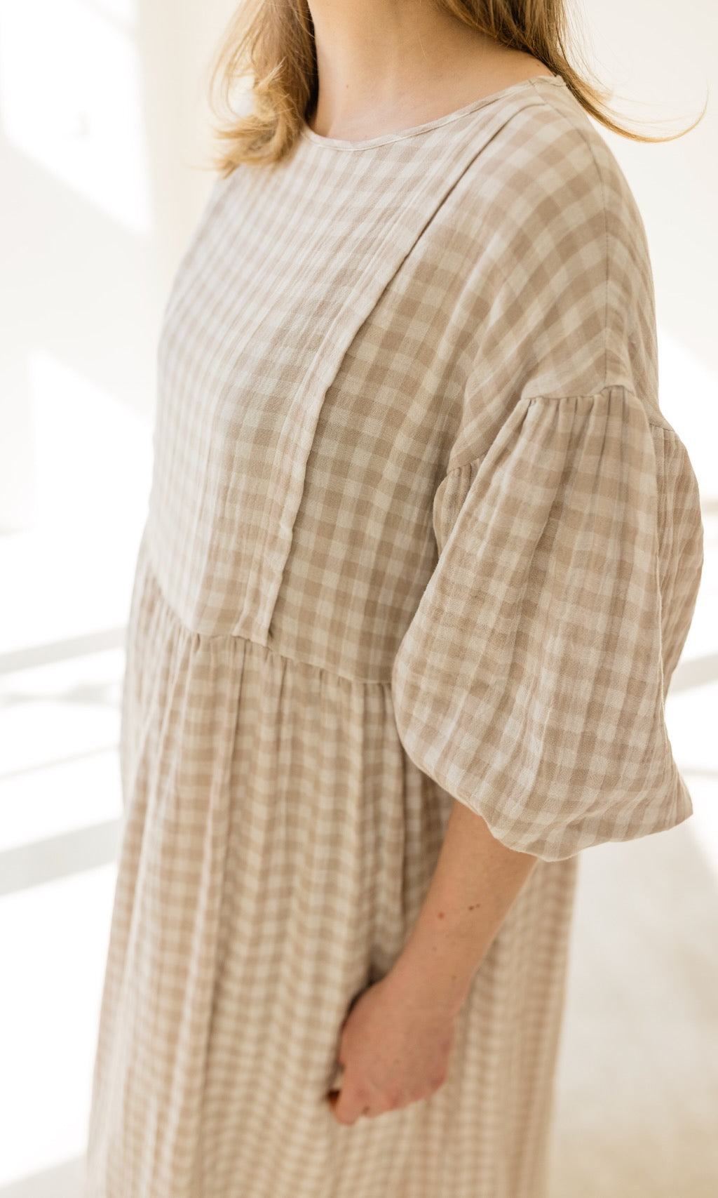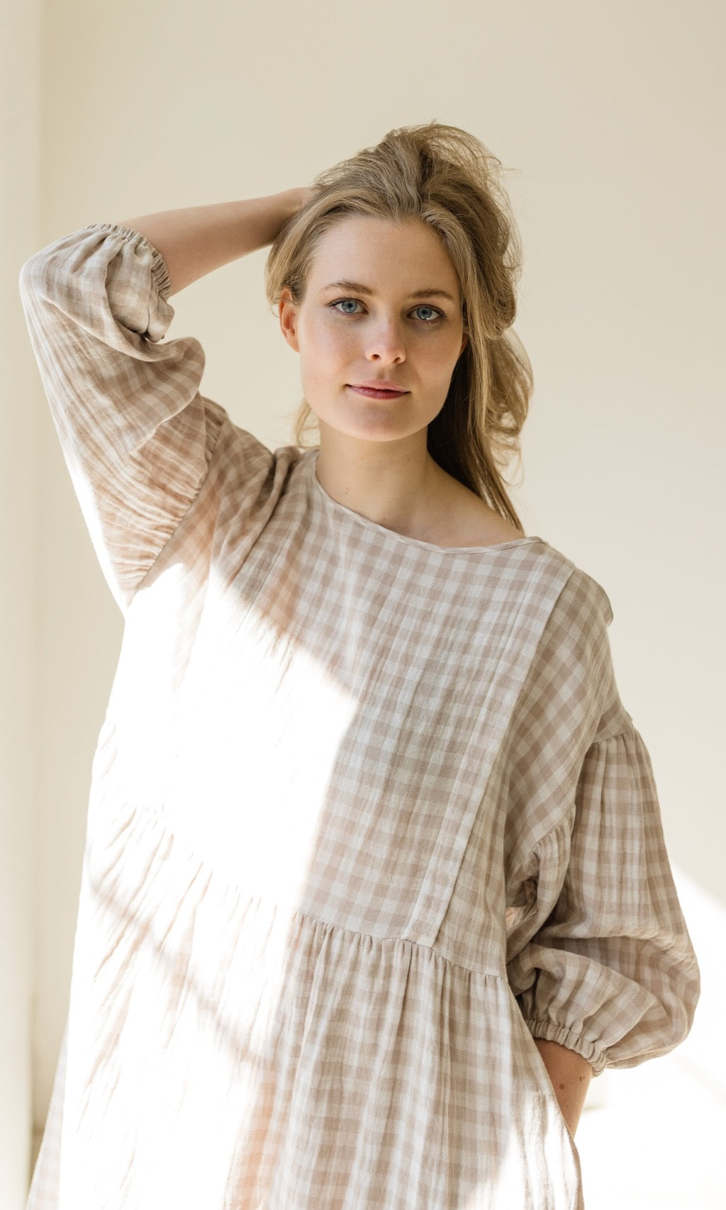 Wir haben unserem Karo-Kleid April ein Frühlings-Upgrade verpasst! Das luftige Musselinkleid im Oversize-Fit erstrahlt jetzt in einer neuen Farbe, einem cremefarbenem Karomuster, und gibt damit romantische French-Vibes.