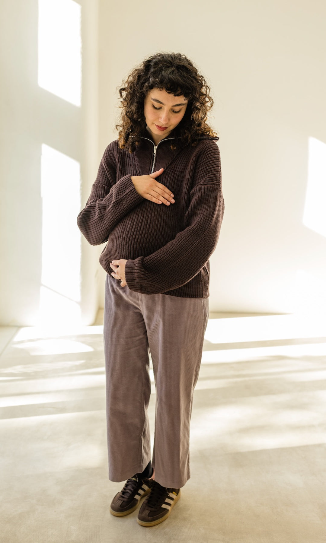 Unsere Schwangerschafts Culotte zeichnet sich durch ihren angenehmen weichen Cord aus. Sie lässt sich vielseitig kombinieren und rundet z. B. mit unseren Jumpern deine Herbst- und Winteroutfits perfekt ab. Entworfen haben wir sie in der Farben Flieder.