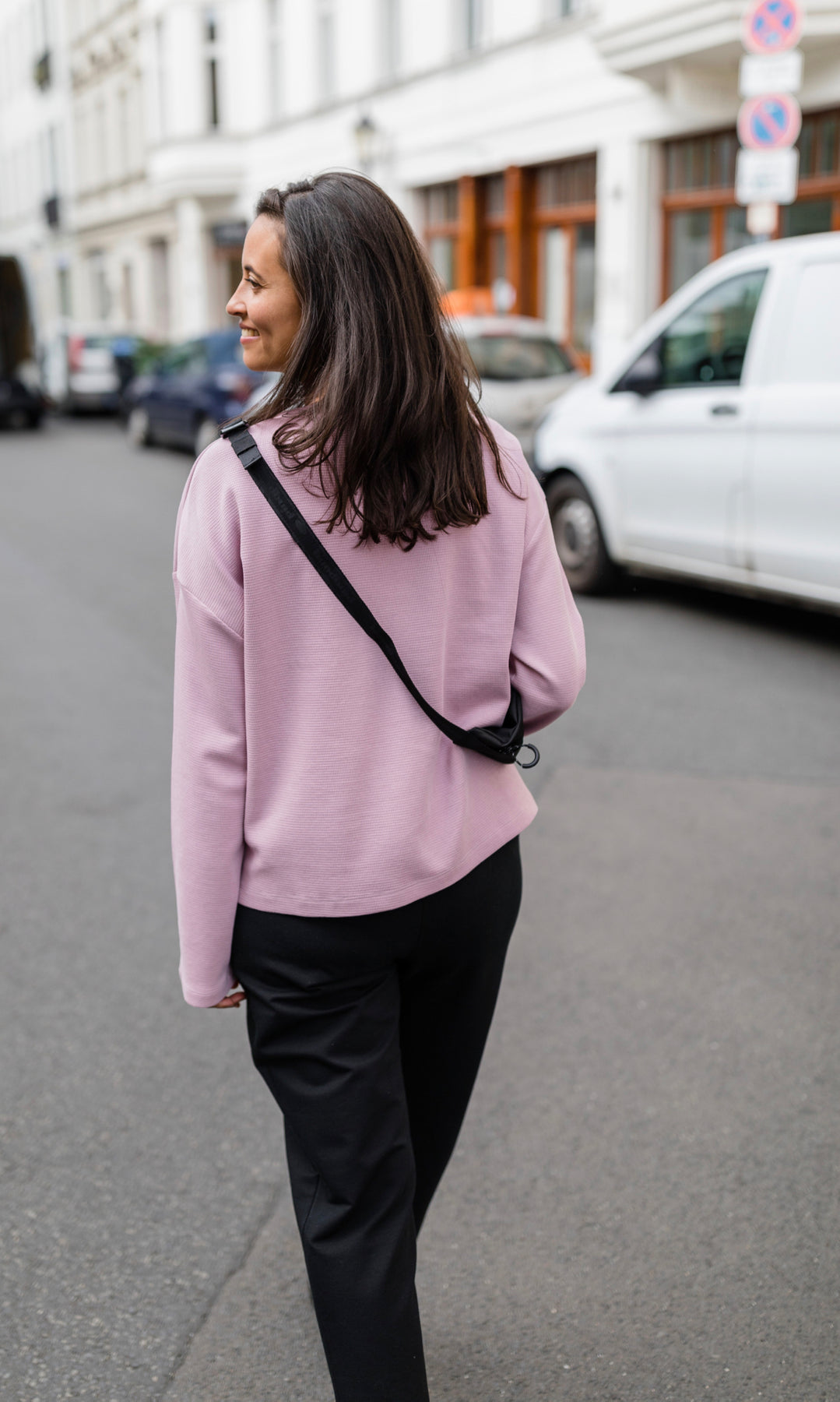 Rückansicht Umstandshose in schwarz im Look mit pinkem Langarmshirt und schwarzer Handtasche. Außenaufnahme in Berliner Straße.