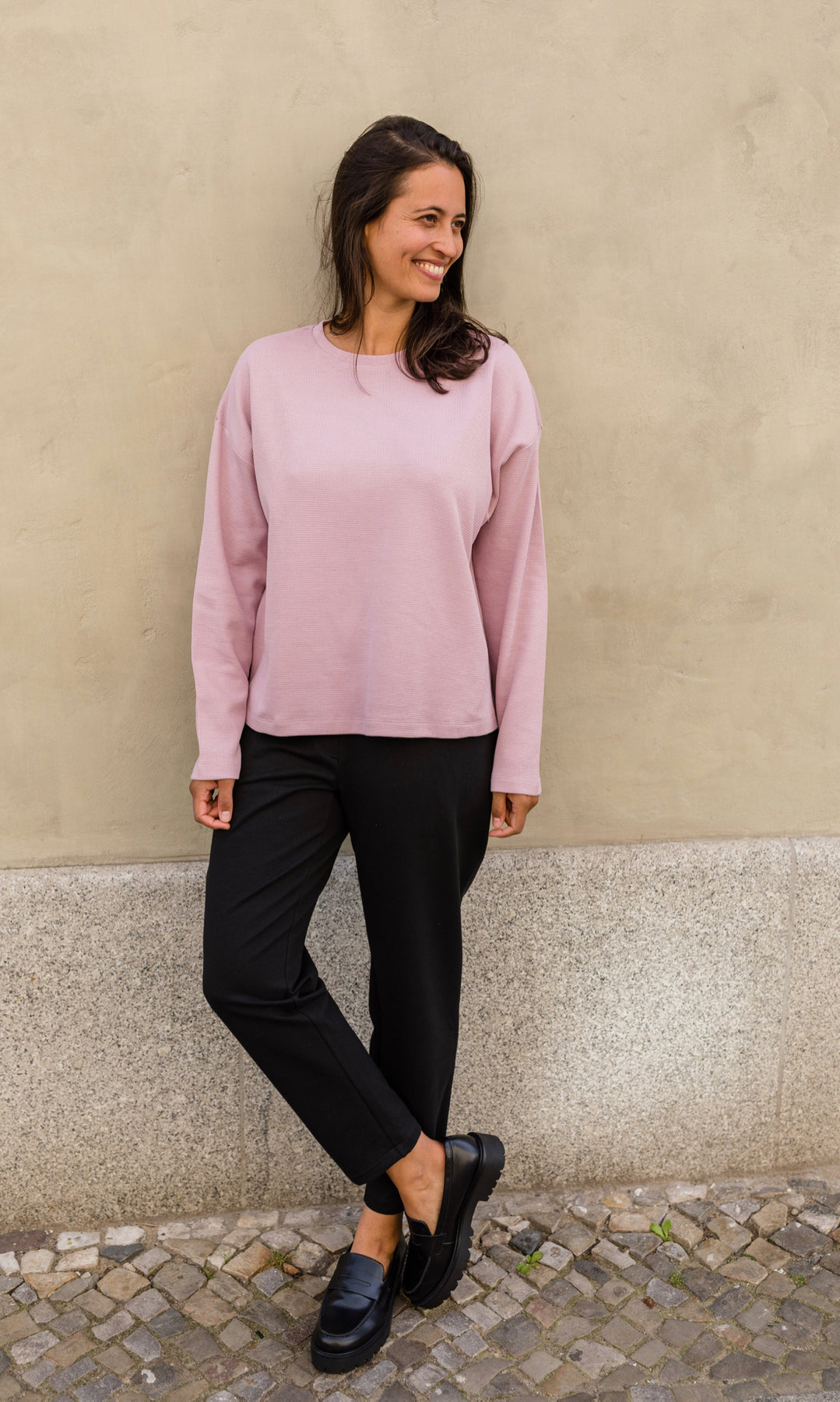Schwarze Umstandshose im Look mit pinkem Langarmshirt und schwarzen Schuhen. Ansicht vor heller Hauswand.