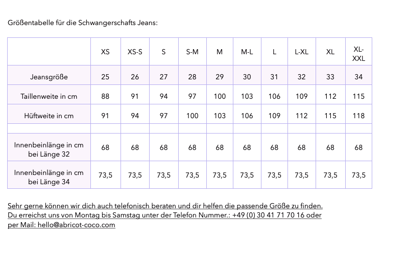 Unsere Umstandsjeans wird aus hochwertiger Bio-Baumwolle gefertigt. Da wir bewusst auf synthetische Fasern verzichten und Naturmaterialien verwenden, kann der Stoff beim Tragen leicht nachgeben. Unser Tipp: Wir empfehlen die Jeans eine Nummer kleiner für den perfekten Sitz zu wählen.