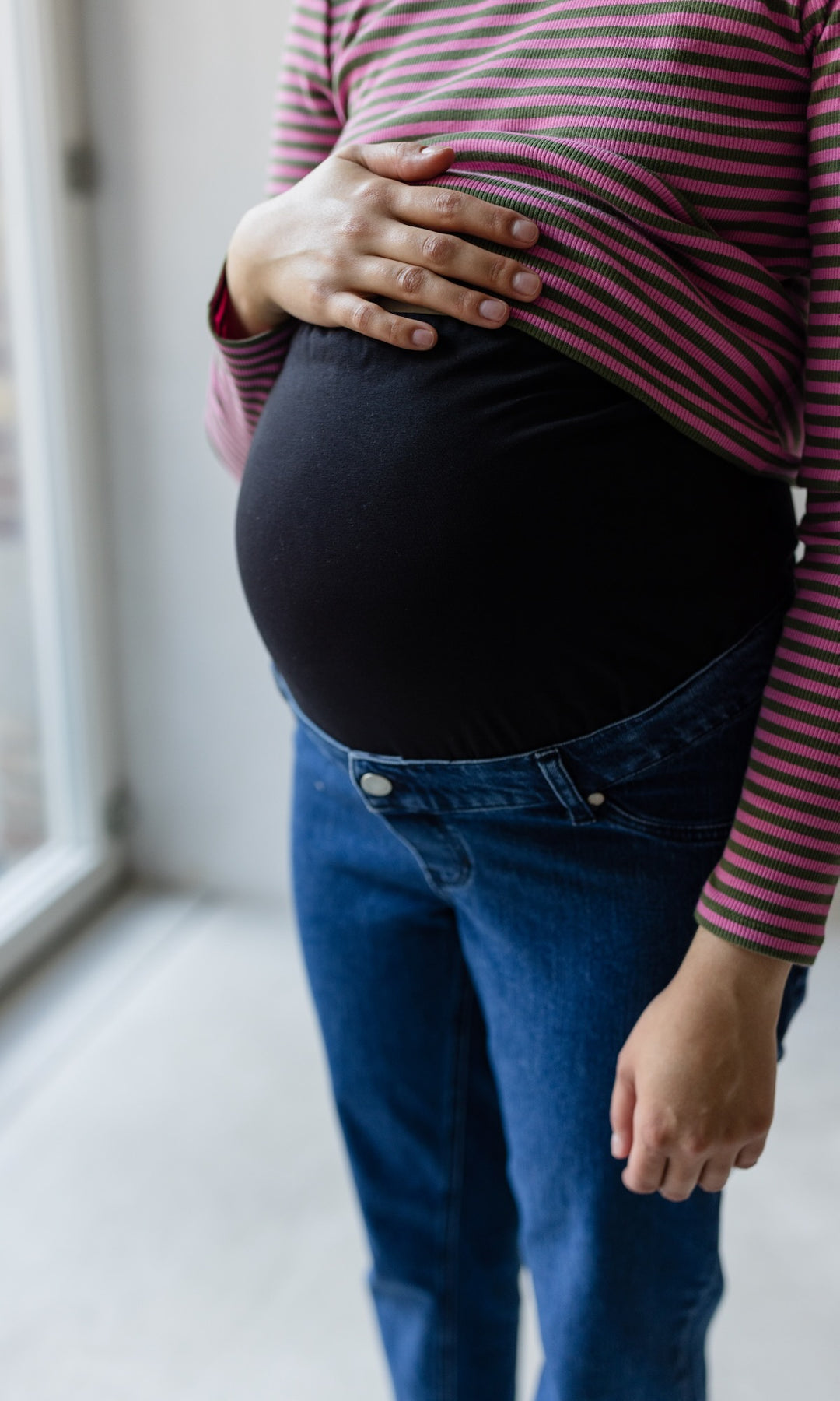Die Schwangerschaftsjeans ist größenverstellbar (über ein Gummiband, das du im Bund findest).