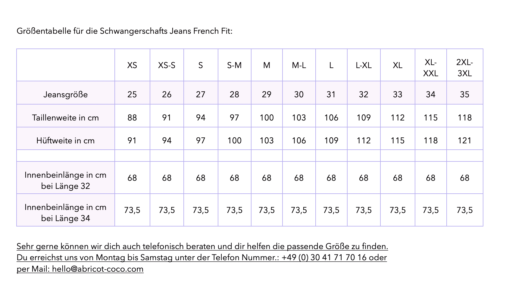 Sehr gerne können wir dich telefonisch beraten und dir helfen die passende Größe zu finden: 030 41 71 70 16