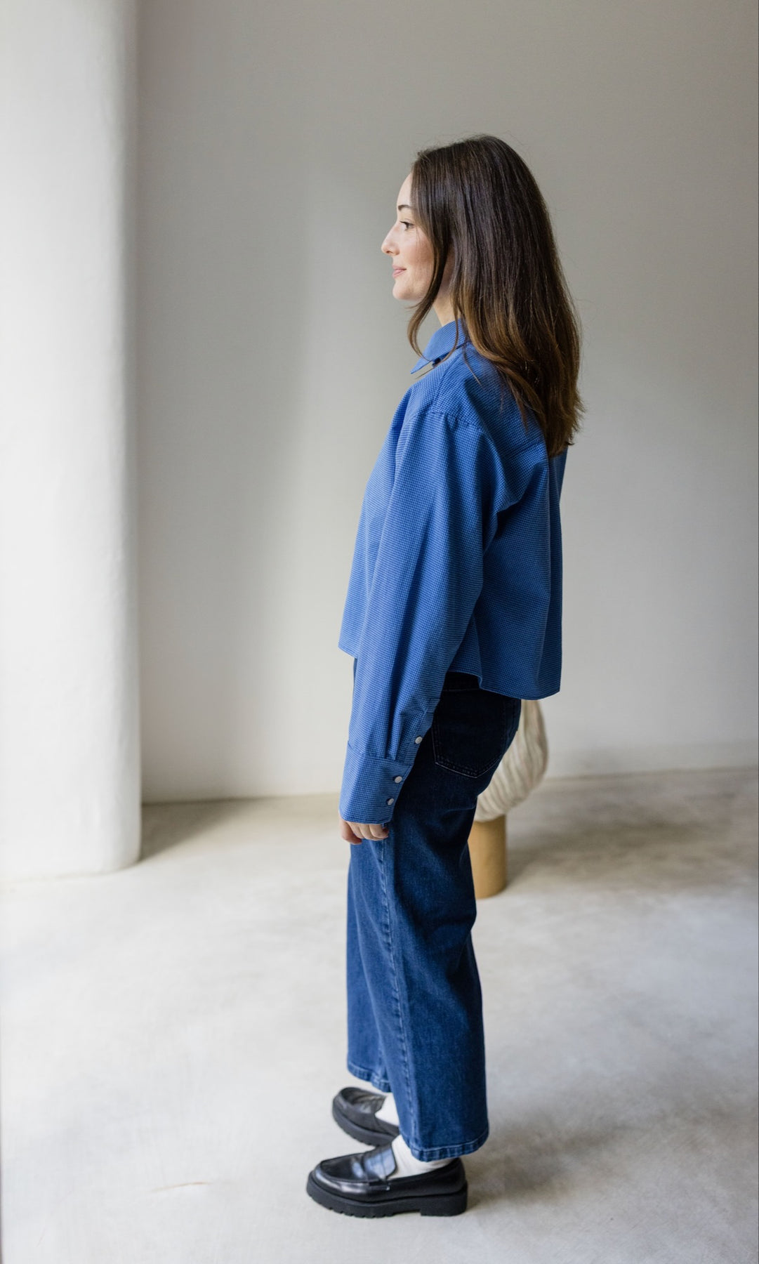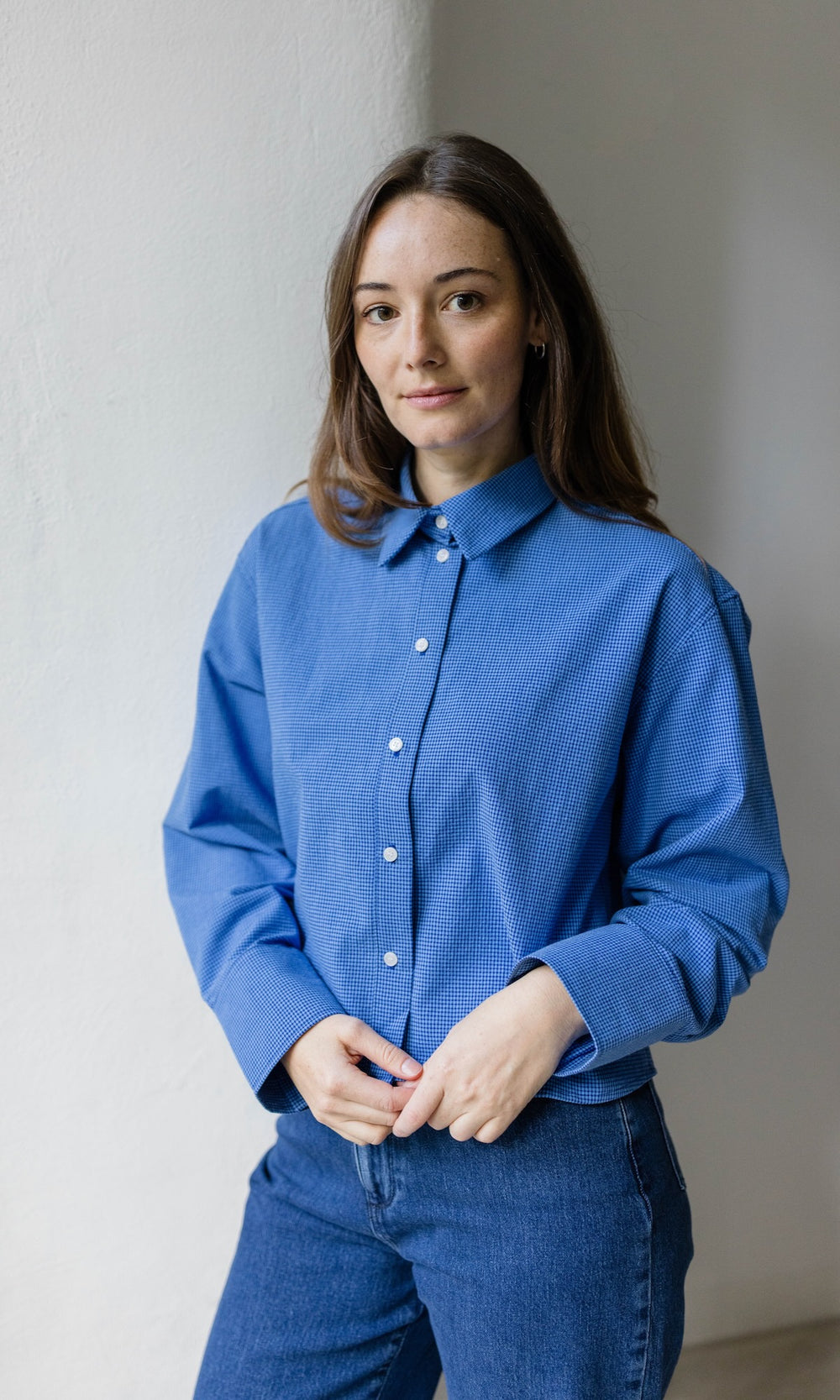 Unser neues Hemd aus 100% Bio Baumwolle ist gerade und im Bauchbereich gecroppt geschnitten, wodurch es sich ideal zu hoch geschnittenen Hosen und Röcken kombinieren lässt. Du kannst es aber auch toll unter unserem Cordkleid oder als weitere Lage unter einem Pullover tragen. Durch das kleine Karomuster wirkt der Blauton noch besonderer. Ein schönes Detail ist die querverlaufende Naht mit großen Raffungen auf dem Rücken, die das Hemd auch von Hinten zu einem Hingucker macht.