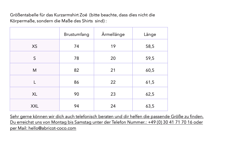 Sehr gerne können wir dich telefonisch beraten und dir helfen die passende Größe zu finden. Du erreichst uns unter: +49 (0) 30 41 71 70 16